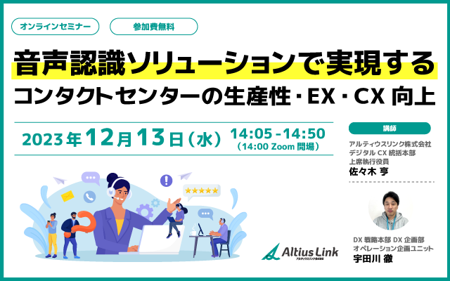 12月13日オンラインセミナー『音声認識AIを使いこなすDXの極意』 ~業務効率・EX・CXを実現する自動化、成功の秘訣を紐解く事例と方法論を解説