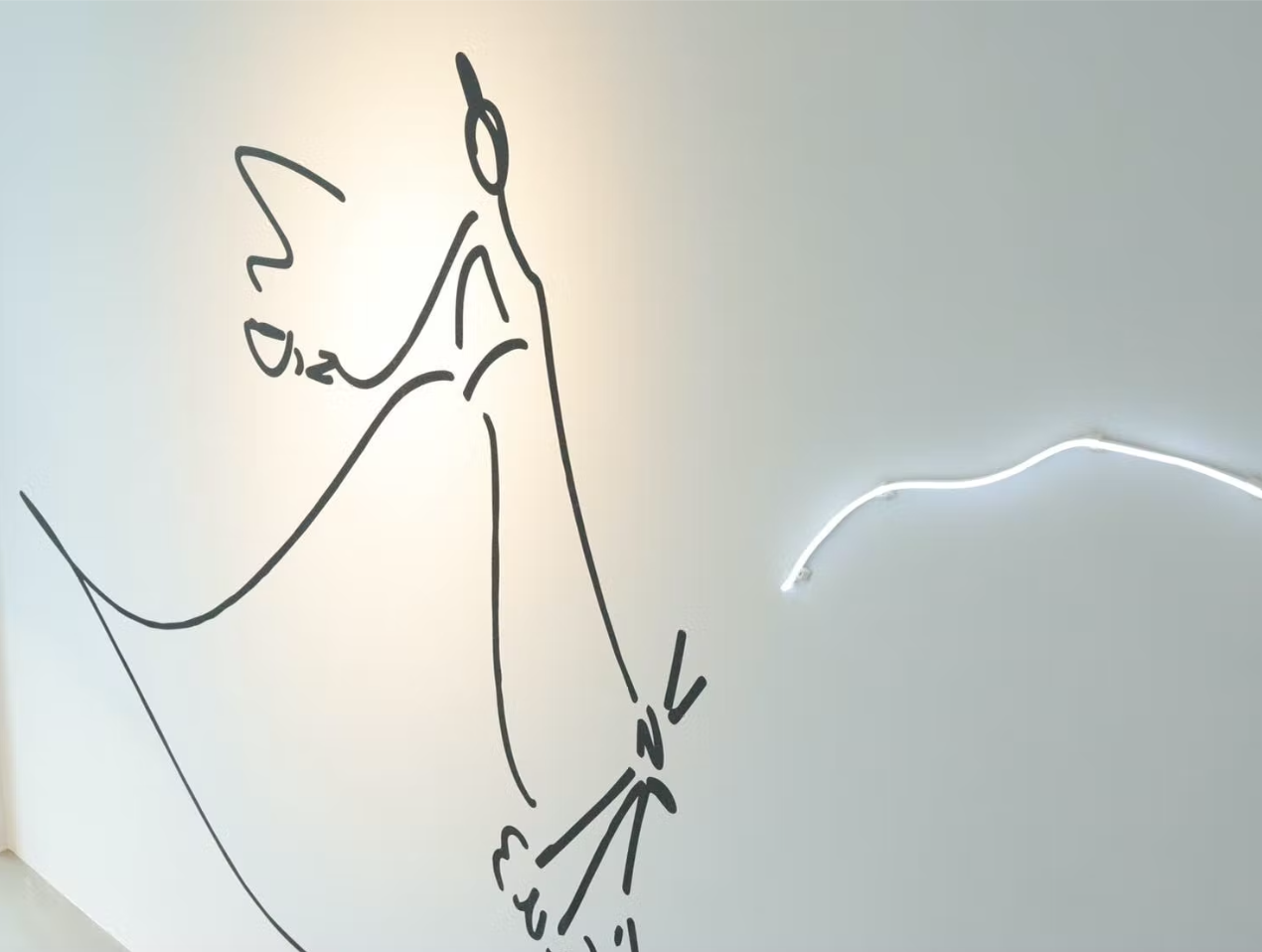 紅茶とお花を持つウェディングドレス姿の女のコのイラスト。2Fへと続くネオンライン、こだわりのウェーブ型ミラー。SNSで人気の作家さんたちとコラボしたオリジナルアクセサリーの数々。大好きなウェディングドレスのショーケースに、そして色を使わないカフェの内装とカラフルな紅茶とマカロン。お一人様に優しいカウンターや全席にあるコンセントとWi-Fi完備。
