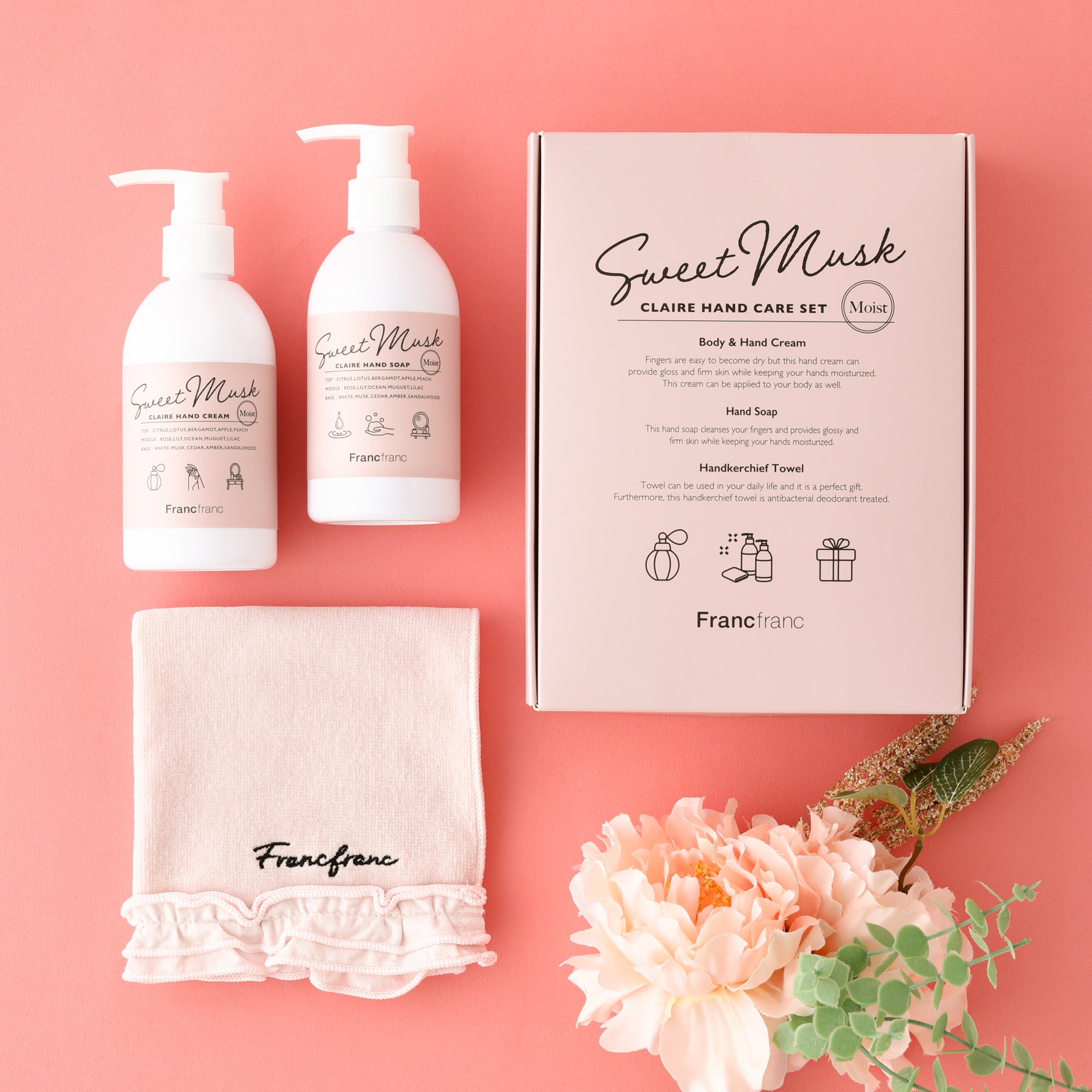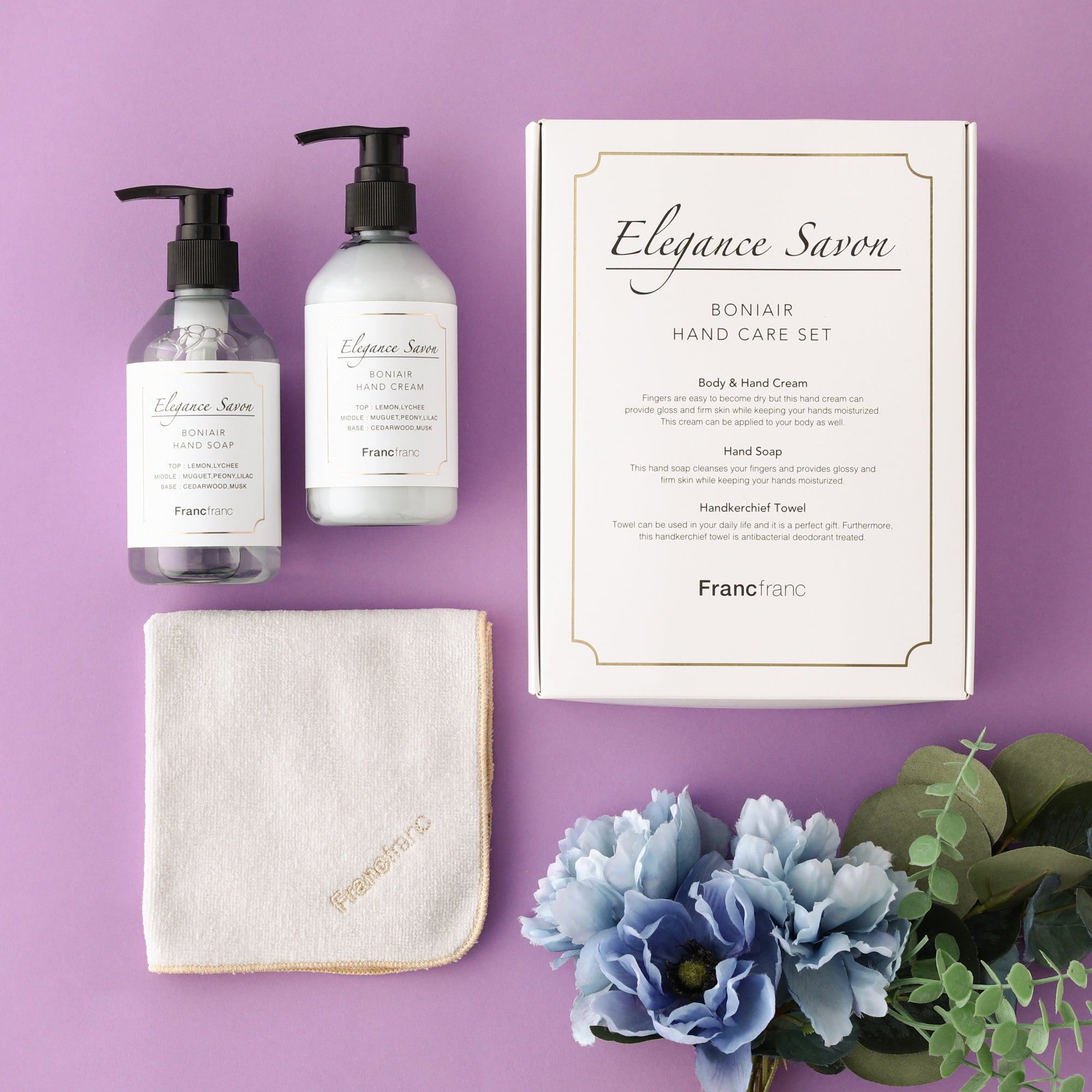ハンドソープ、ハンカチ、ハンドクリームがセットになったハンドケアギフトセットにフレグランスで人気のクレアシリーズとボニエールシリーズが新登場。アップルやピーチ、ローズなどを調合したスイートムスクの香りが人気のクレアシリーズにはフリルがアクセントになったハンカチを、レモンやライチ、ライラックなどを調合したエレガンスサボンの香りが大人の方に人気のボニエールシリーズにはゴールドパイピングが上品な印象のハンカチをセットしました。