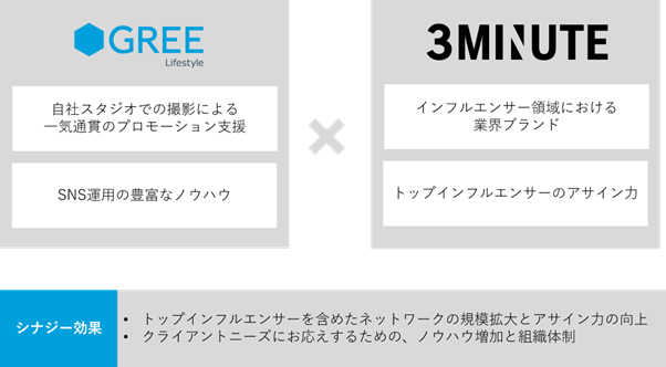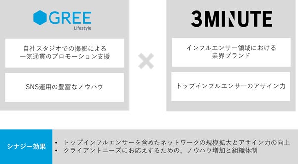 この度の事業継承によりグリーライフスタイルの強みであるSNS運用のノウハウや、自社スタジオで撮影・運用・分析までの一気通貫した支援が可能である事、また、3ミニッツの強みであるインフルエンサー領域における業界ブランドやトップインフルエンサーのアサインが可能な事など、両社の強みを活かし1つの組織となる事でSNS領域の事業拡大を加速させます。