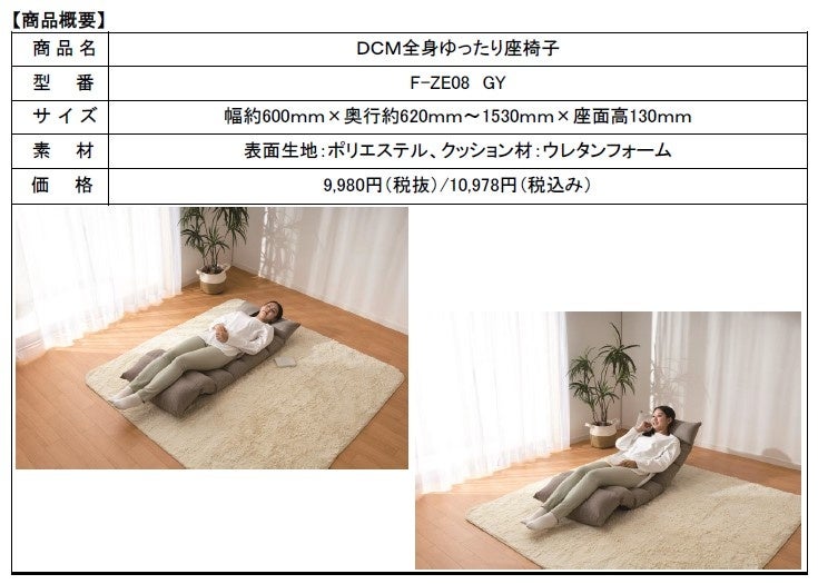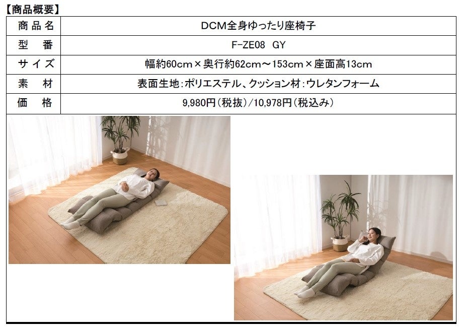 お好みの姿勢で全身を支える「DCM 全身ゆったり座椅子」新発売