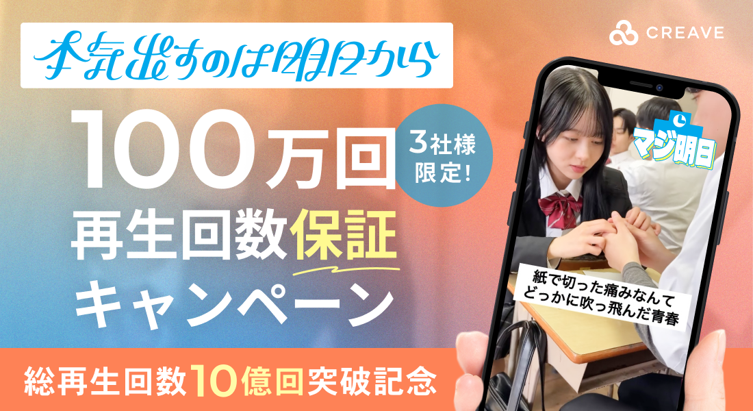 クリエイターとの共創を通じて企業のマーケティング課題を解決する、株式会社CREAVE(本社:東京都千代田区、代表取締役社長:中村真奈、以下 CREAVE)は、バーチャルショートドラマを活用した自社IP『本気出すのは明日から”マジ明日”』のSNSアカウント開始10ヶ月で総再生回数10億回、フォロワー数40万人を突破したことを記念し、3社様限定「再生回数保証タイアップ投稿」キャンペーンを開始致しました。