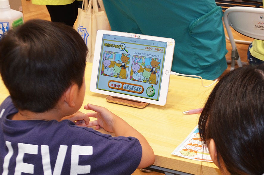 ニフティキッズの楽しい「まちがいさがし」ゲームに挑戦。なかなかあと1つがみつからないと苦戦しながら、保護者の方も一緒に何度もチャレンジしてくれました。