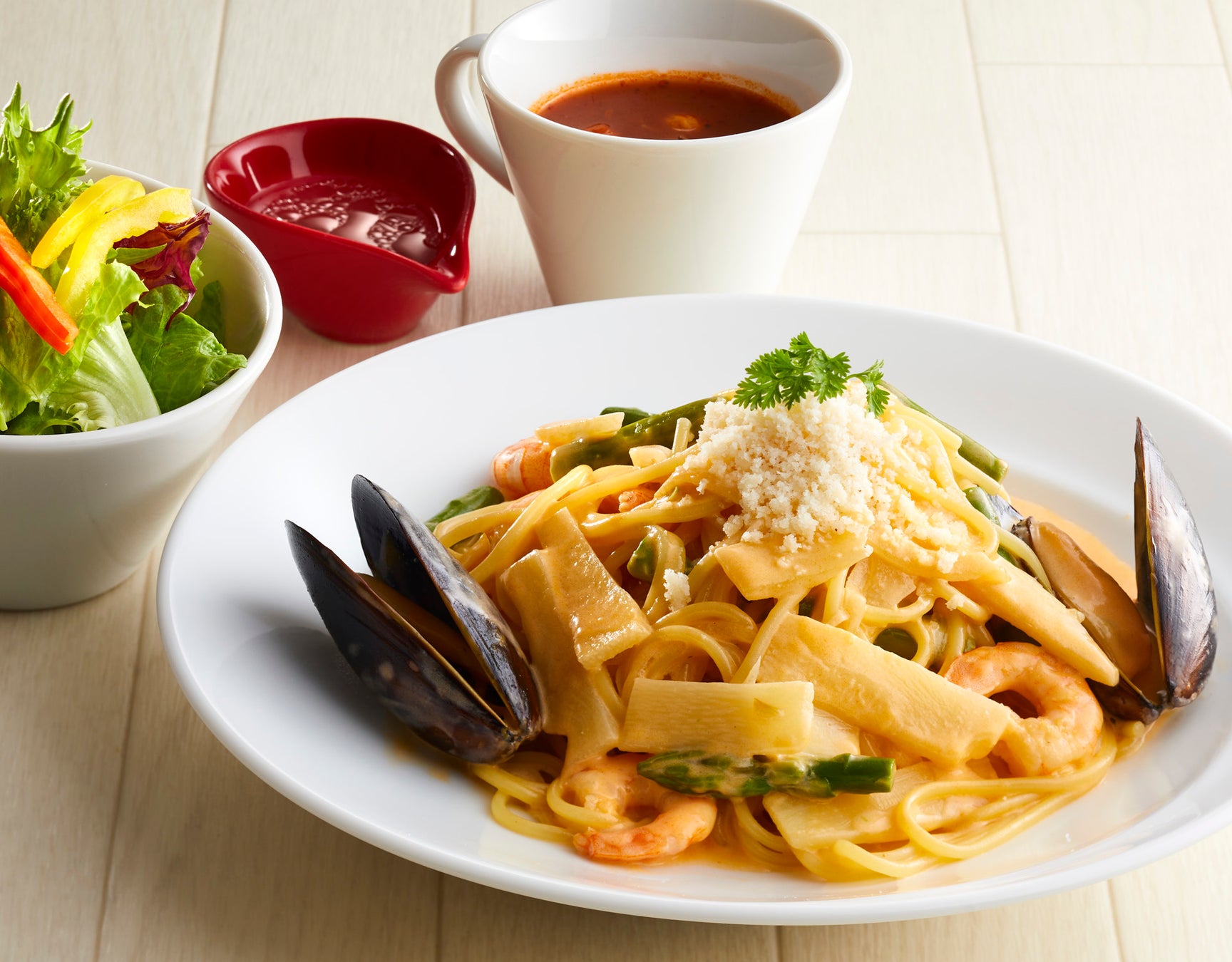 ムール貝や小海老などの魚介にアスパラや筍を添えた、春らしい彩りの生パスタです。