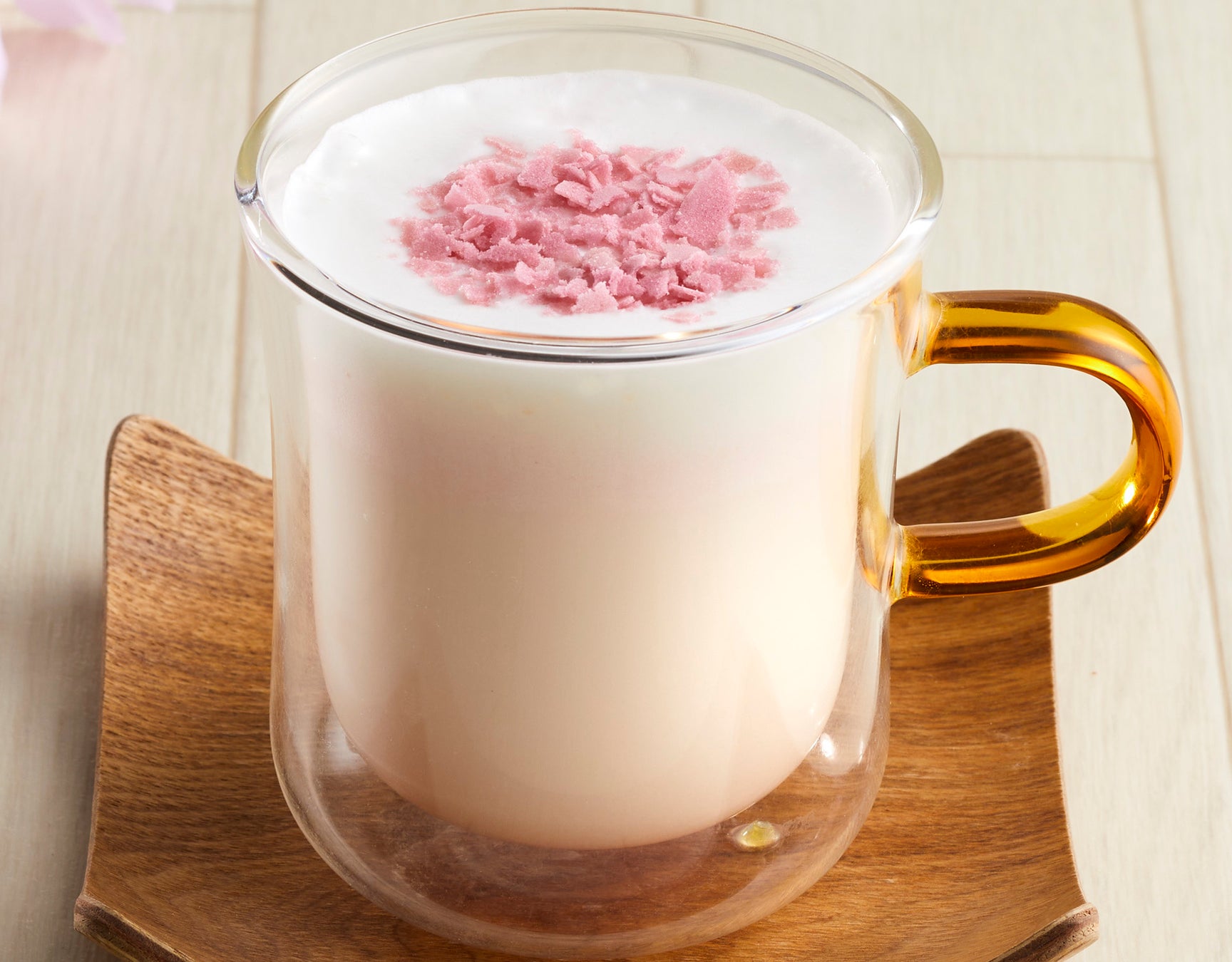 桜の上品な香りが口いっぱいに広がる、ほんのり甘い桜色のラテ。