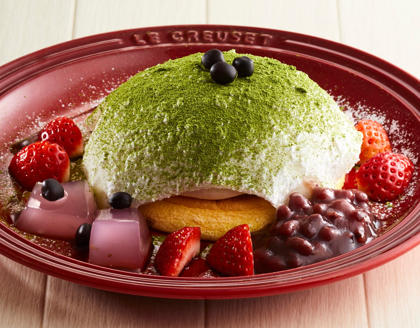 パンケーキと抹茶のホイップクリームを薄い水晶餅で包んだ、「ふわ × もち食感」の新感覚スイーツ!桜わらび餅や苺を添えて、華やかに仕上げました。