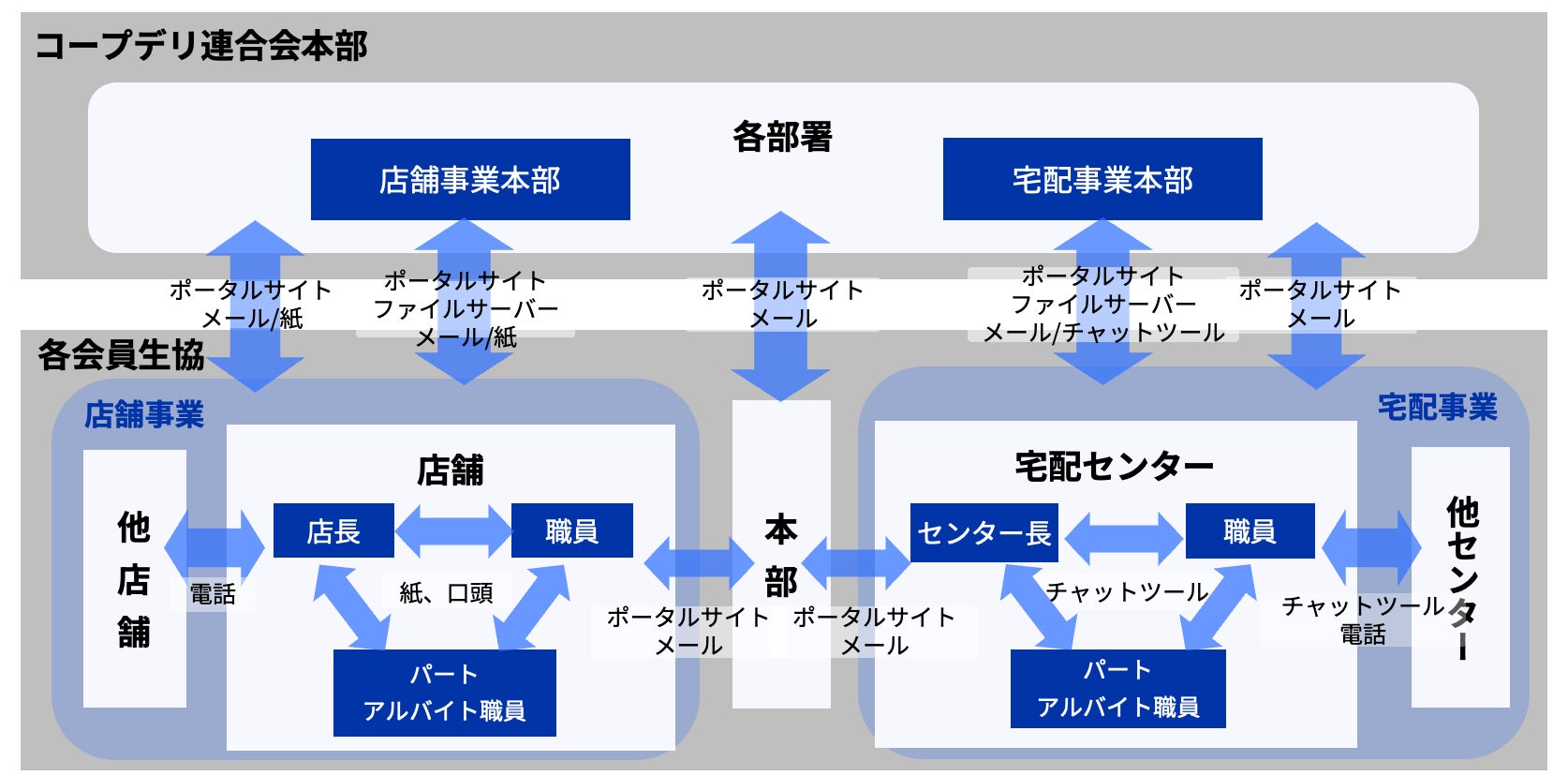コープデリ連合会では、2017年からオンプレミス環境で独自開発した情報共有ポータルを運用していましたが、連合会および事業部、各会員生協、ならびに各会員生協内の事業部が存在する多層的な組織構造のもと、情報の伝達経路が複雑化していることが課題でした。