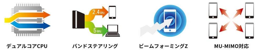 「バンドステアリング機能」を搭載し、より快適な帯域(5GHz/2.4GHz帯)を自動で選択・接続します。