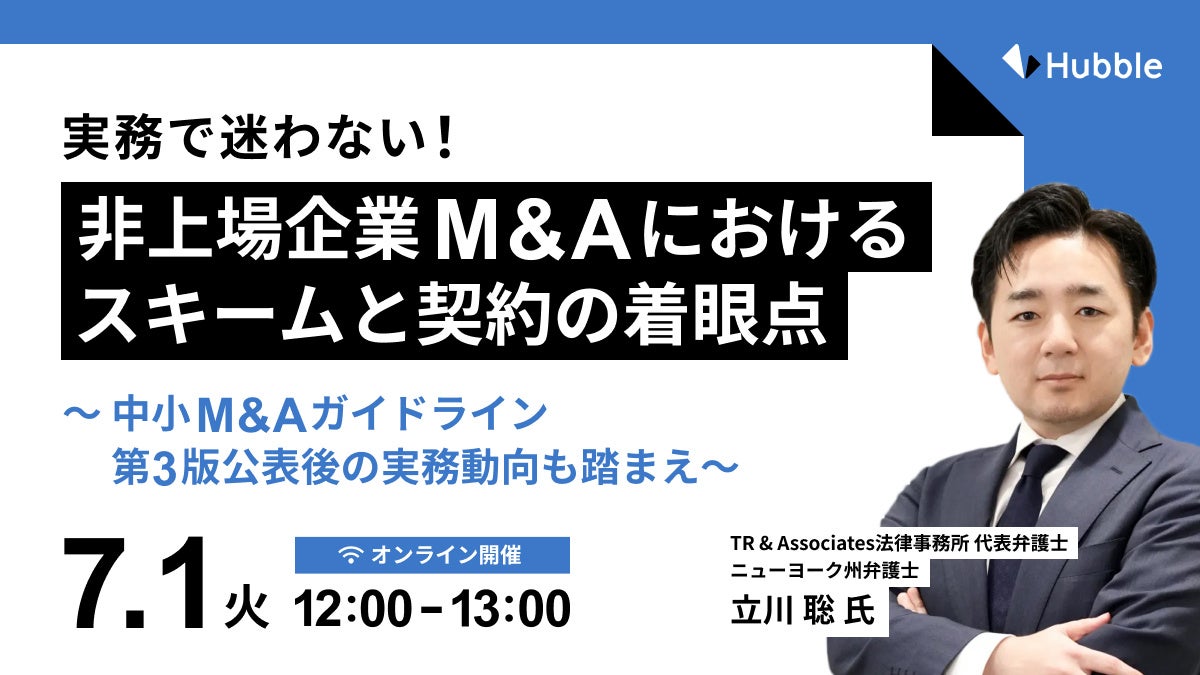 法務と事業部門の協業性を高める契約業務・管理クラウドサービス「Hubble(ハブル)」を提供する株式会社Hubble(東京都渋谷区、CEO:早川 晋平)は、2025年7月1日(火)12:00より、非上場企業を対象としたM&Aに関する無料オンラインセミナー「実務で迷わない!非上場企業M&Aにおけるスキームと契約の着眼点~中小M&Aガイドライン第3版公表後の実務動向も踏まえ~」を開催いたします。