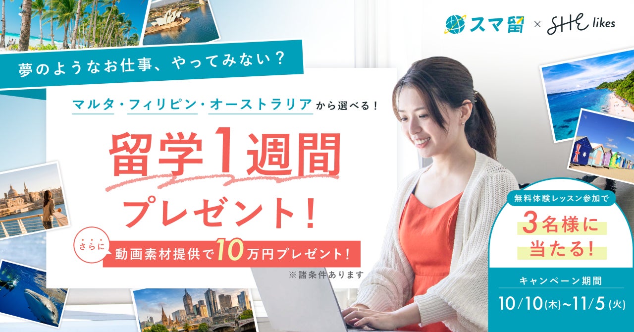 憧れの海外留学を1週間無料で体験!「夢のようなお仕事、やってみない?」SHE × スマ留連携キャンペーンについて