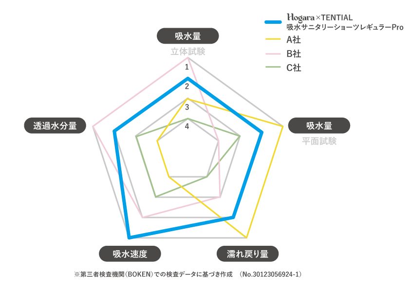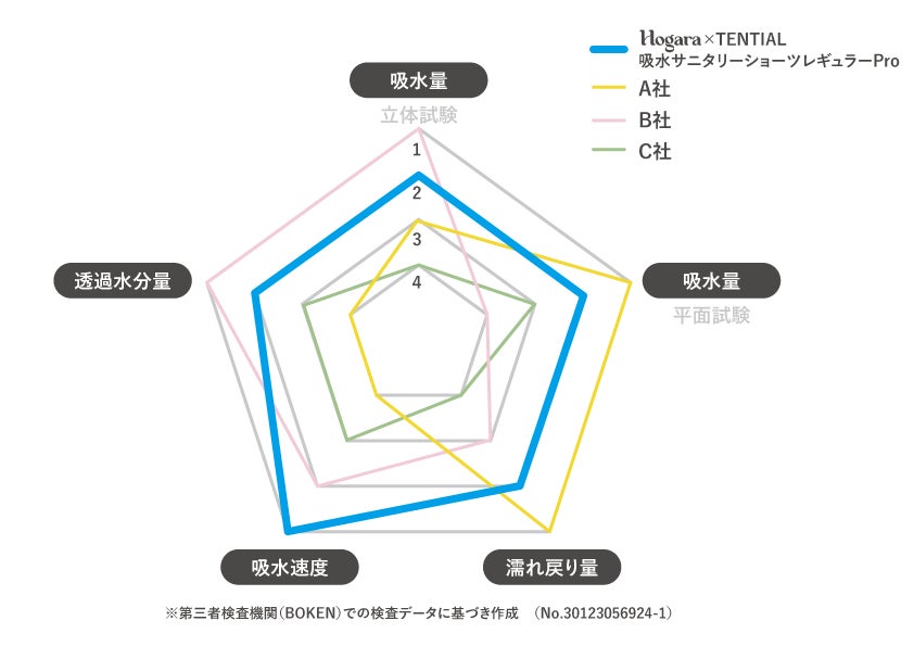 アンケートにて未経験者・経験者ともに蒸れやベタつきに対して抵抗感や不安・不満を持つ人が多いことが伺えましたが、今回HogaraとTENTIALで開発した「吸水サニタリーショーツレギュラーPro」はこれらの不安・不満を解決する素材・加工を採用。さらに製品試験でも4項目において高得点を獲得しています。