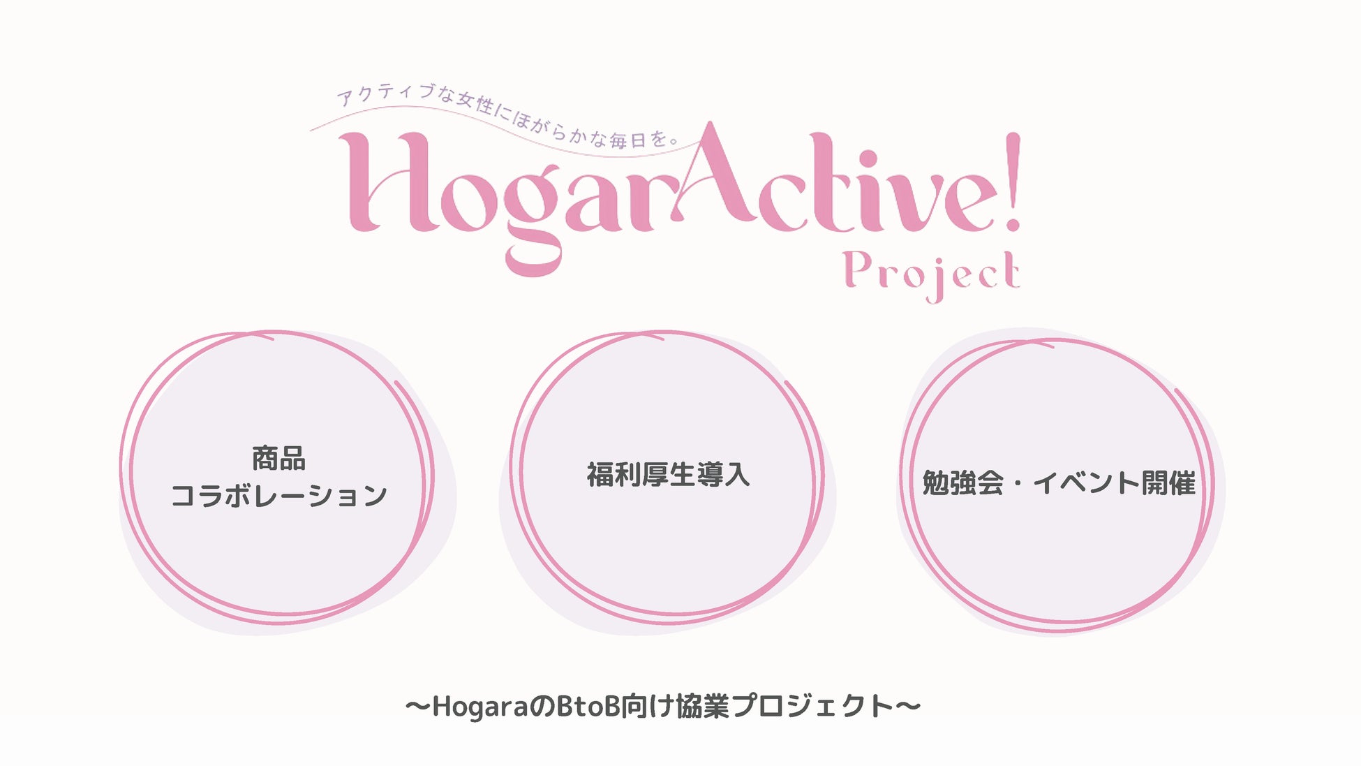 「HogarActive! Project」は、様々な企業様とのコラボレーションを通して、日々をアクティブに生きる女性たちが少しでもほがらかに過ごせるよう応援をしていく、BtoB向け協業プロジェクトの名称です。共通の思いを持つ様々な企業様や団体様と、商品コラボレーション・福利厚生導入・勉強会やイベント等において協業することで、様々な場所で活躍するアクティブな女性たちの応援に繋がっていくことを目指しています。