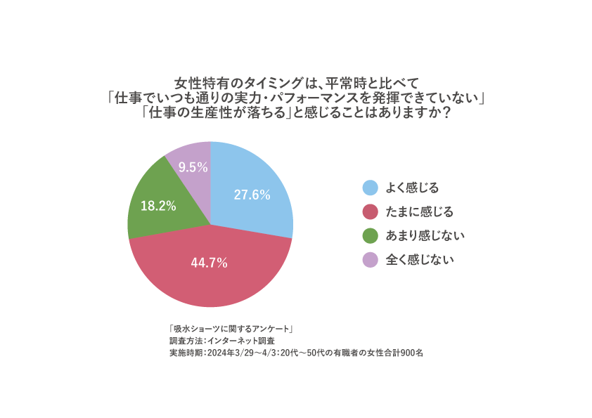 商品の販売に先駆け、20代~50代の有職者の女性約900名を対象に「吸水ショーツに関するアンケート」を実施しました。「女性特有のタイミングは、平常時と比べ、仕事でいつも通りの実力・パフォーマンスを発揮できていない、仕事の生産性が落ちる、と感じることがありますか?」という質問について、70%以上の方が「感じる」と回答しました。また、吸水ショーツ未経験者への「あなたが“吸水ショーツ”を使わないのはなぜですか?」という質問では、「衛生面が不安(37.5%)」「蒸れそう(34.2%)」「ベタつきそう(23.3%)」といった、衛生面や着用中の肌触りに関して不安を抱く人が多いことが伺えました。さらに吸水ショーツ経験者への「今まで使用してみてどのような不満がありましたか?」という質問では、「値段が高い(37.3%)」という回答が一番多く、次に「蒸れた(38.6%)」「ベタついた(31.4%)」の順で回答が多くなりました。未経験者・経験者ともに蒸れやベタつきに対して抵抗感や不安・不満を持つ人が多いことが伺えました。