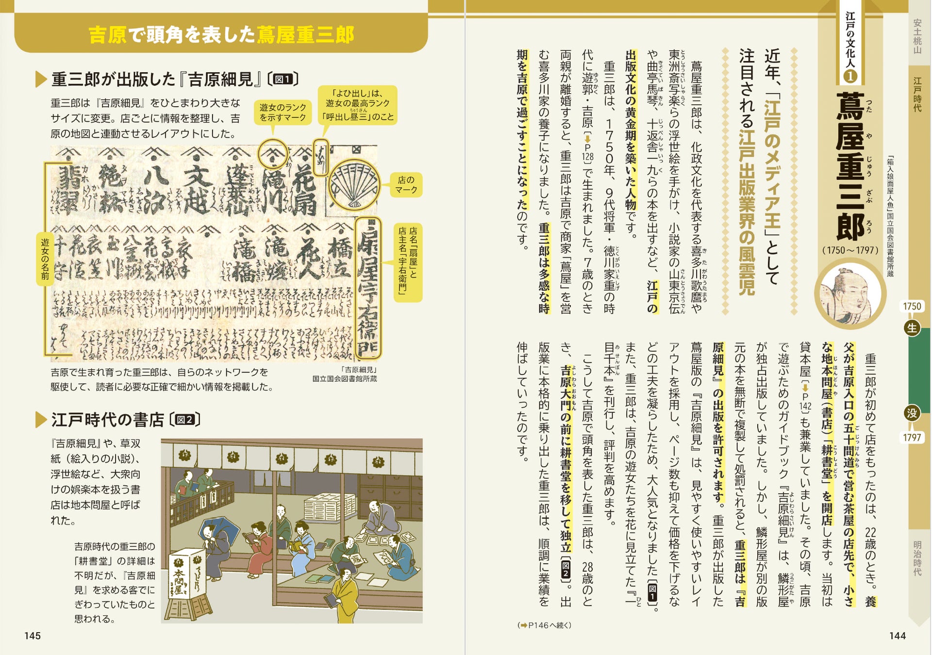 また、2025年の大河ドラマでも取り上げられる、「江戸のメディア王」蔦屋重三郎についてもくわしく紹介。喜多川歌麿、東洲斎写楽、葛飾北斎ら浮世絵画家とのエピソードや、