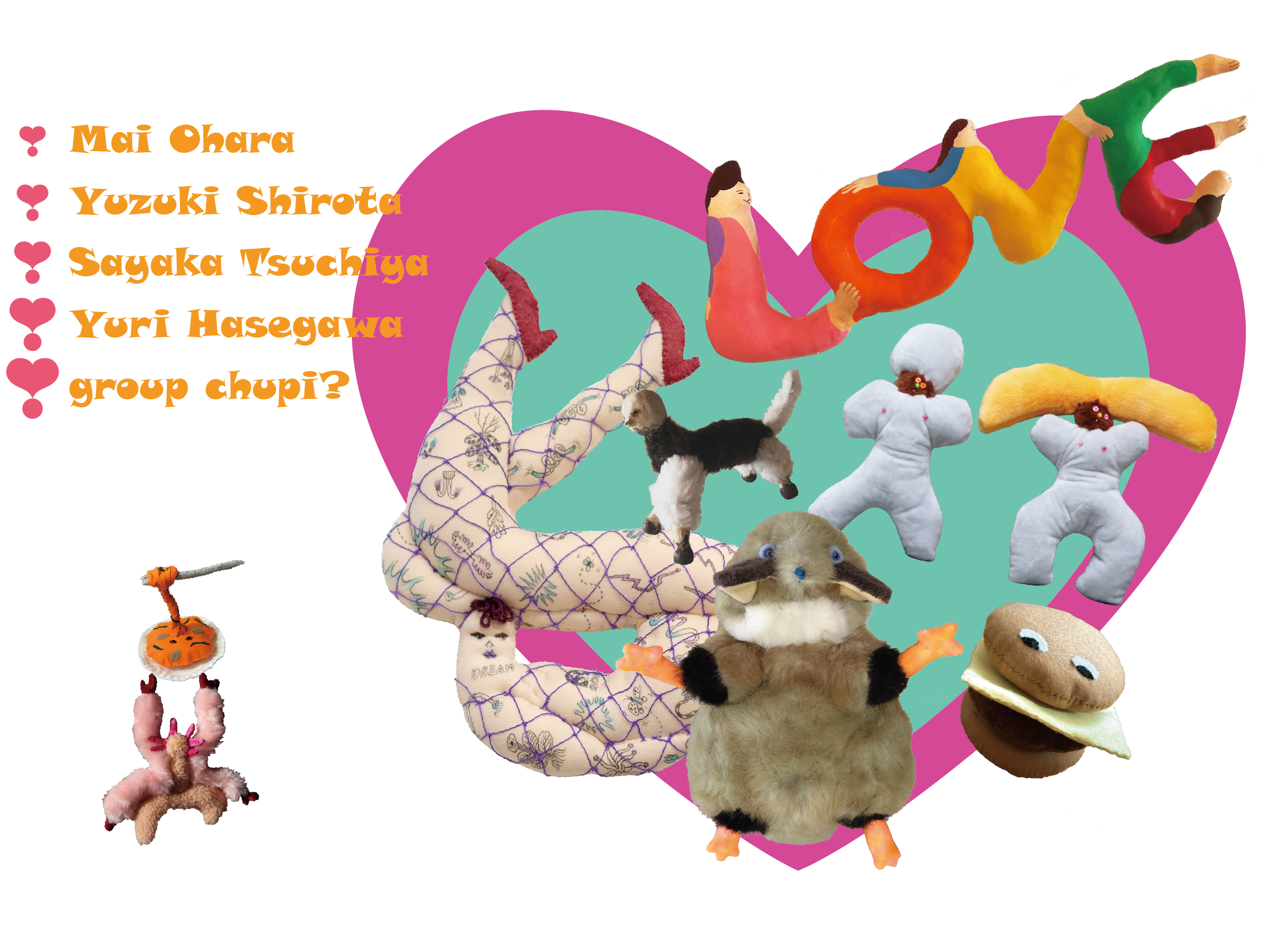 日常にある景色や植物などのモチーフを、どこかパンキッシュで生命力溢れる作品へと昇華させる、大原舞。ユーモラスなフォルムと、個性豊かな性格を持つ愛らしいキャラクターたちを変幻自在に生み出す、代田柚月。人形の柔らかく躍動感のあるポージングと独自のタッチで文字や数字を表現する、土屋さやか。どこかでみたようなキャラクターをモチーフに、思わず脱力してしまうようなユルいぬいぐるみを作り出す、長谷川有里。陶器×モフモフの新しい組み合わせで、不思議な知的生命体「ちゅぴ」に命を宿すユニット、group chupi?。