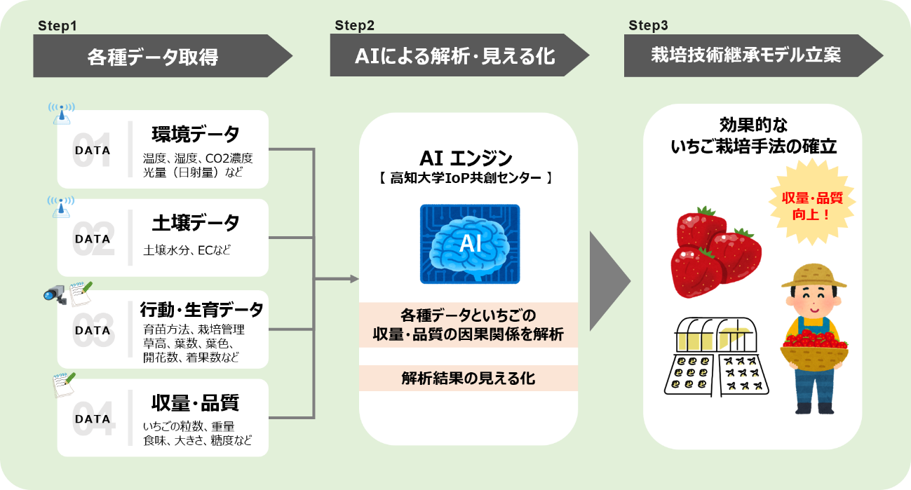 この度、佐川町のいちご圃場において、収穫量増加と品質向上を目的に、いちご農家の栽培データを取得し、AIで解析することで、経験や勘の見える化と継承可能なモデルづくりをめざした実証実験を行うことになりました。