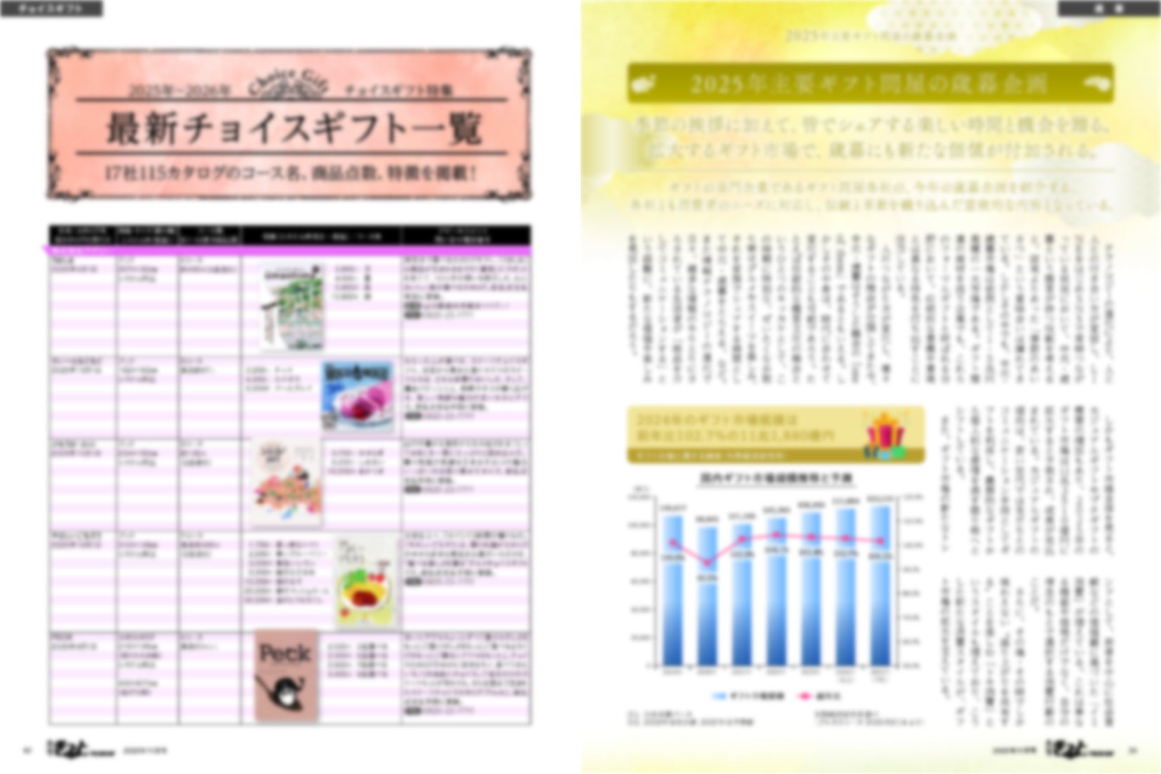 さらに、17社・115種のカタログを網羅した最新チョイスギフト総覧や歳暮企画特集も掲載。ギフトに関わるメーカー・小売・流通業界の皆様に必見の内容です。ぜひご一読ください。
