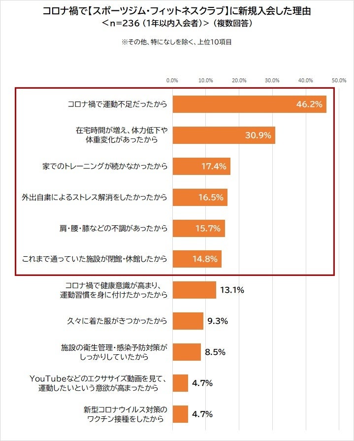 つづいて「1年以内」の入会者236名に対し、「コロナ禍で【スポーツジム・フィットネスクラブ】に新規入会した理由」(複数回答)を聴取したところ、「コロナ禍で運動不足だったから」(46.2%)が最も多く、次いで「在宅時間が増え、体力低下や体重変化があったから」(30.9%)、「家でのトレーニングが続かなかったから」(17.4%)、「外出自粛によるストレスを解消したかったから」(16.5%)、「肩・膝・腰などの不調があったから」(15.7%)が続きました。運動不足やストレス、一時期“コロナ膝(※3)”の増加が話題になりましたが、体の不調などが主な理由のほか、「これまで通っていた施設が閉館・休館したから」(14.8%)といったコロナ禍の社会的問題を理由に挙げる人もいました。