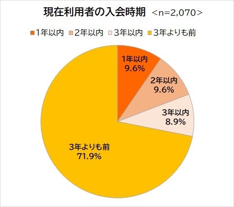 2021年11月6日時点、フィットネスクラブ現利用者2,070名の「入会時期」を聴取したところ、「3年よりも前」の入会者が71.9%と最も多く、次いで「1年以内」(9.6%)、「2年以内」(9.6%)の入会者が続きました。コロナ禍の新規入会者と断定できる「1年以内」、また2020年11月以降の入会者の「2年以内」を含めて、10~20%以内がコロナ禍での新規入会者であることが伺えます。