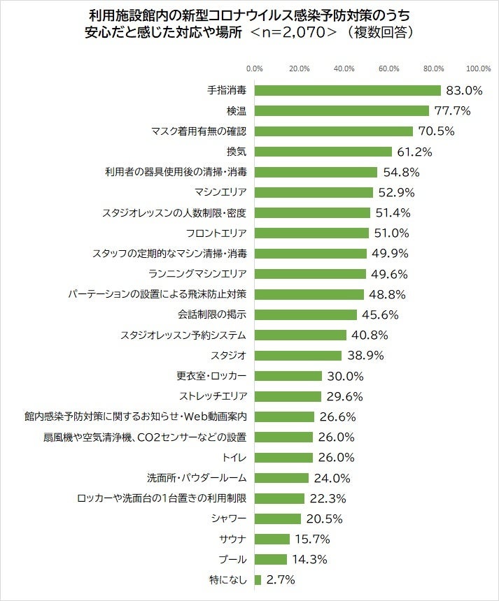 なお、安心だと感じた場所では、「マシンエリア」(52.9%)、「フロントエリア」(51.0%)、「ランニングマシンエリア」(49.6%)、「スタジオ」(38.9%)が上位に。「コロナ禍においても密にならない工夫や声掛けがあった点が良かった(ティップネス/50代・女性)」といった声もあり、施設内の感染対策が徹底されていることが伺えます。