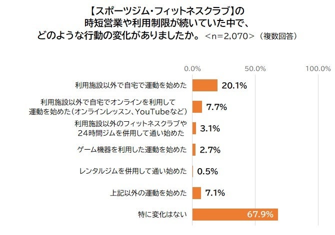 今回、スポーツジム・フィットネスクラブを現在利用していると回答した2,070名に対し、「スポーツジム・フィットネスクラブの時短営業や利用制限が続いていた中での行動変化」について聴取したところ、最も多かったのは「特に変化はない」の67.9%で、次いで「利用施設以外で自宅で運動を始めた」(20.1%)、「利用施設以外で自宅でオンラインを利用して運動を始めた(オンラインレッスン、YouTubeなど)」(7.7%)、「利用施設以外のフィットネスクラブや24時間ジムを併用して通い始めた」(3.1%)などが続きました。