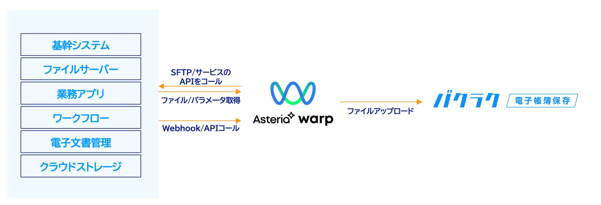 連携の第1弾として、バクラクシリーズ内の電子帳簿保存法、インボイス制度に対応したクラウドストレージ製品である「バクラク電子帳簿保存」とASTERIA Warp(アステリア ワープ)」の連携を開始します。これにより企業は、自社が管理する基幹業務システム内やクラウドストレージ内に保存されている証憑類を「バクラク電子帳簿保存」にシームレスに転送保管することが可能となり、2024年1月に施行予定の電子帳簿保存法への対応に寄与します。