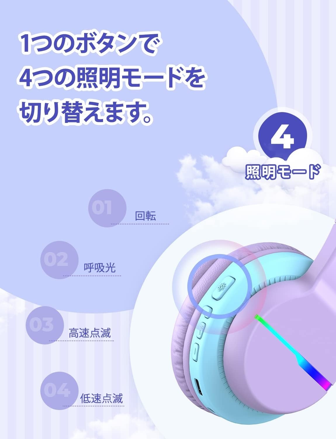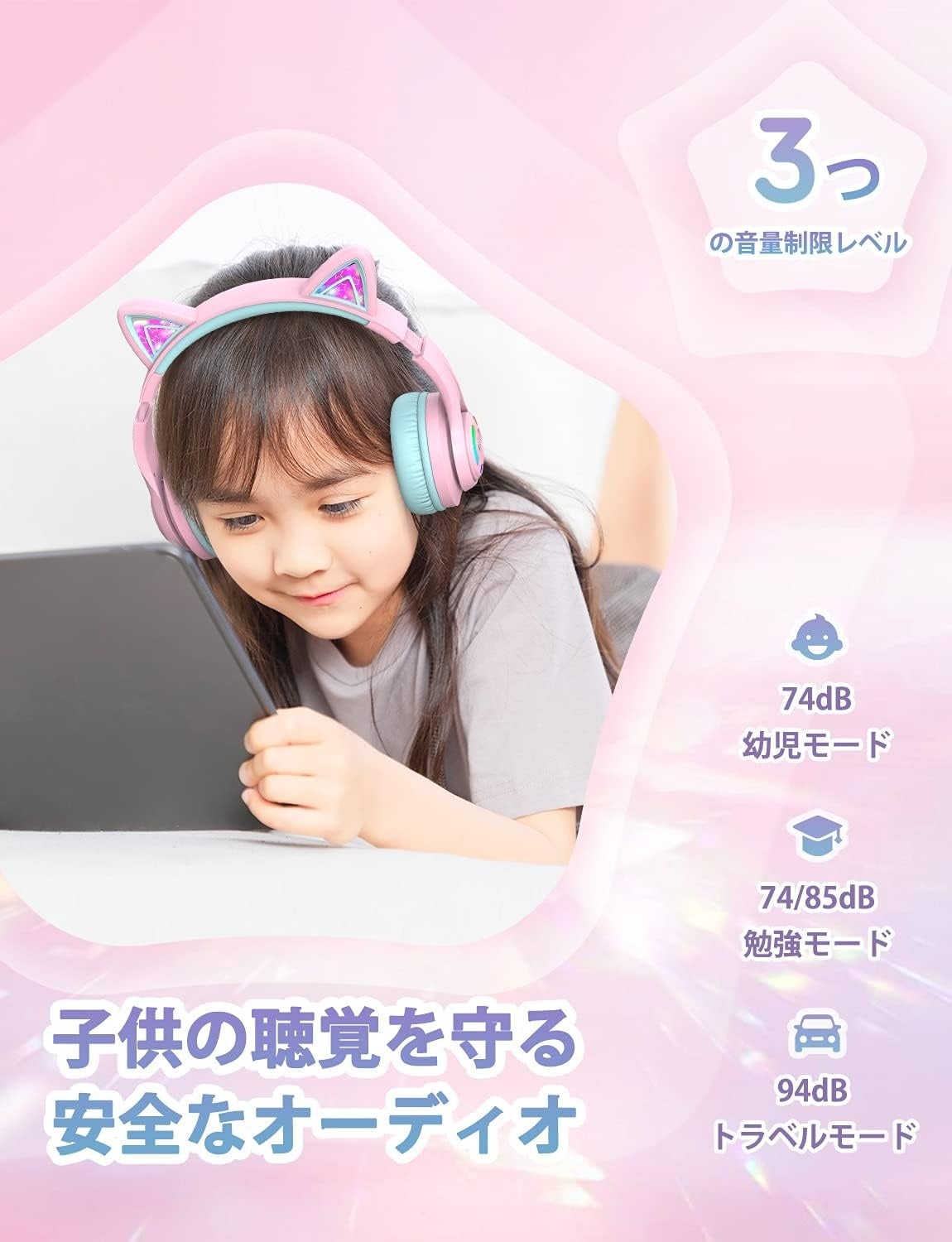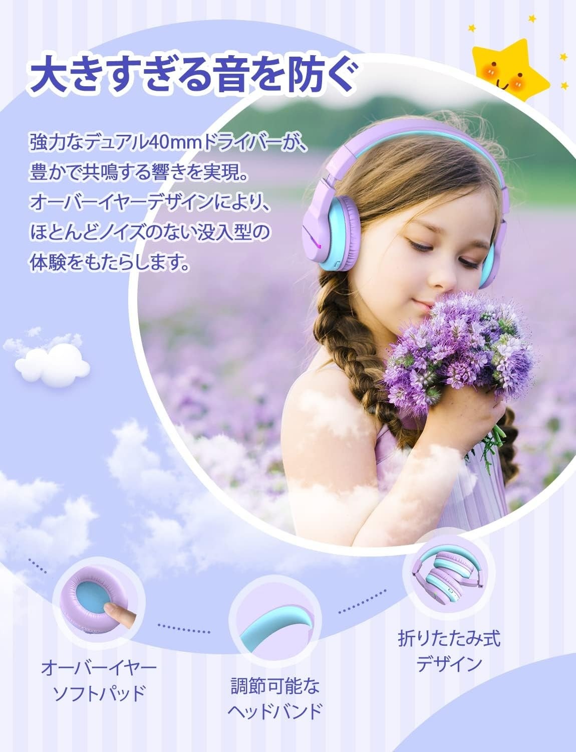 最大音量を94dBに設定することで、お子様の聴力を保護し、誤った操作による過剰な音量を防ぎます。※音量制限の切り替え機能・マイク機能は、Bluetooth接続時のみ対応します。有線接続時は、常に最大音量85dB(変更不可)となりま