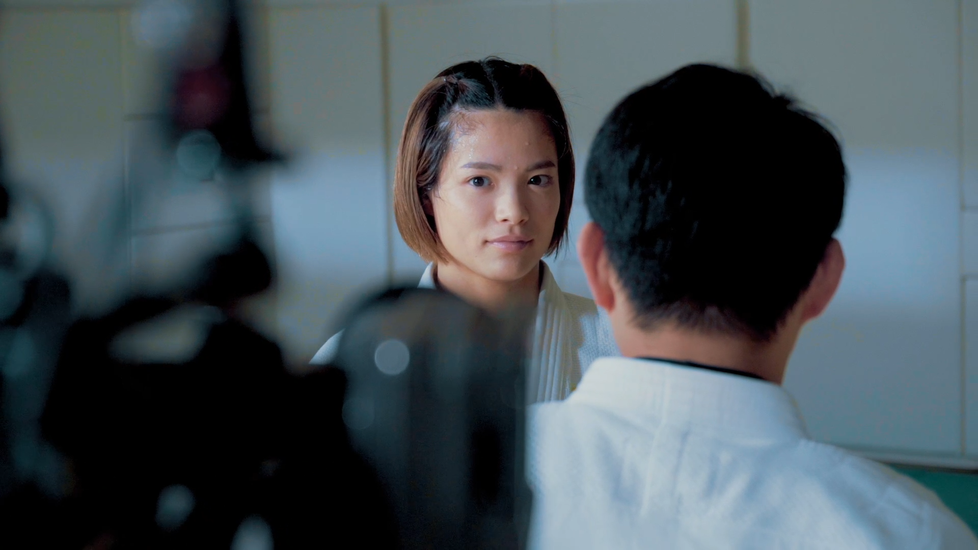 しかし、柔道場のシーンでは阿部さんの堂々たる姿に、現場にもより一層緊張感が走ります。白い柔道着に身を包んだ阿部さんは、普段の試合の様子からもうかがえるように真剣で凛々しい印象で、柔道家として強くあるべき姿を見せてくれました。