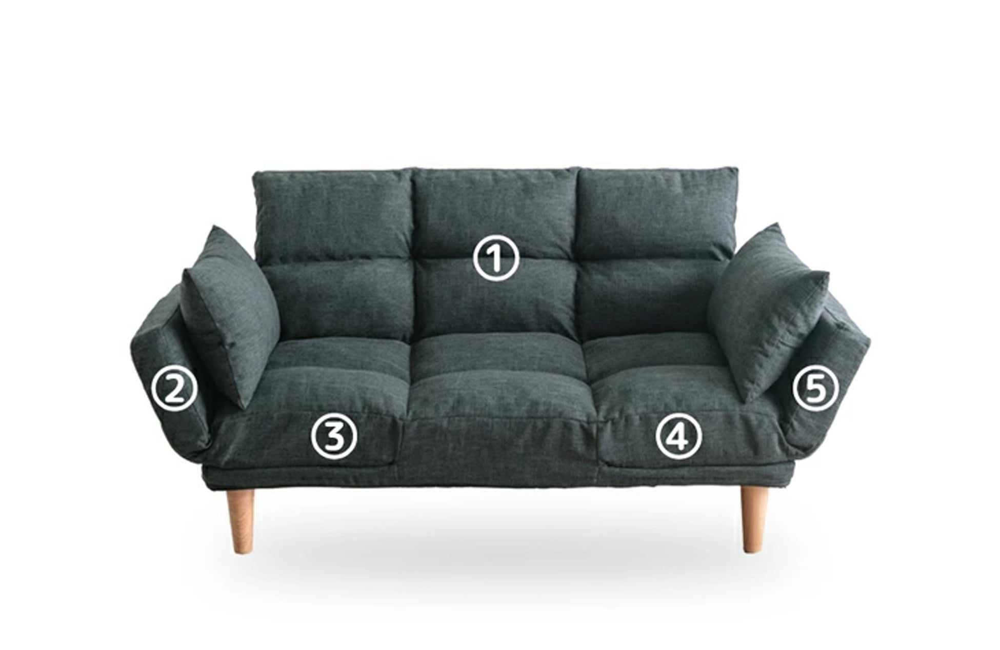 本製品の最大の特徴は、5か所のリクライニング機能を搭載し、あらゆる姿勢に合わせてソファの形状を変化させることができる点です。背もたれは5段階、肘掛け2か所は5段階、座面2か所は14段階で角度を調節でき、取りたい体勢に合わせて細かく調整することで、快適に寛ぐことができます。