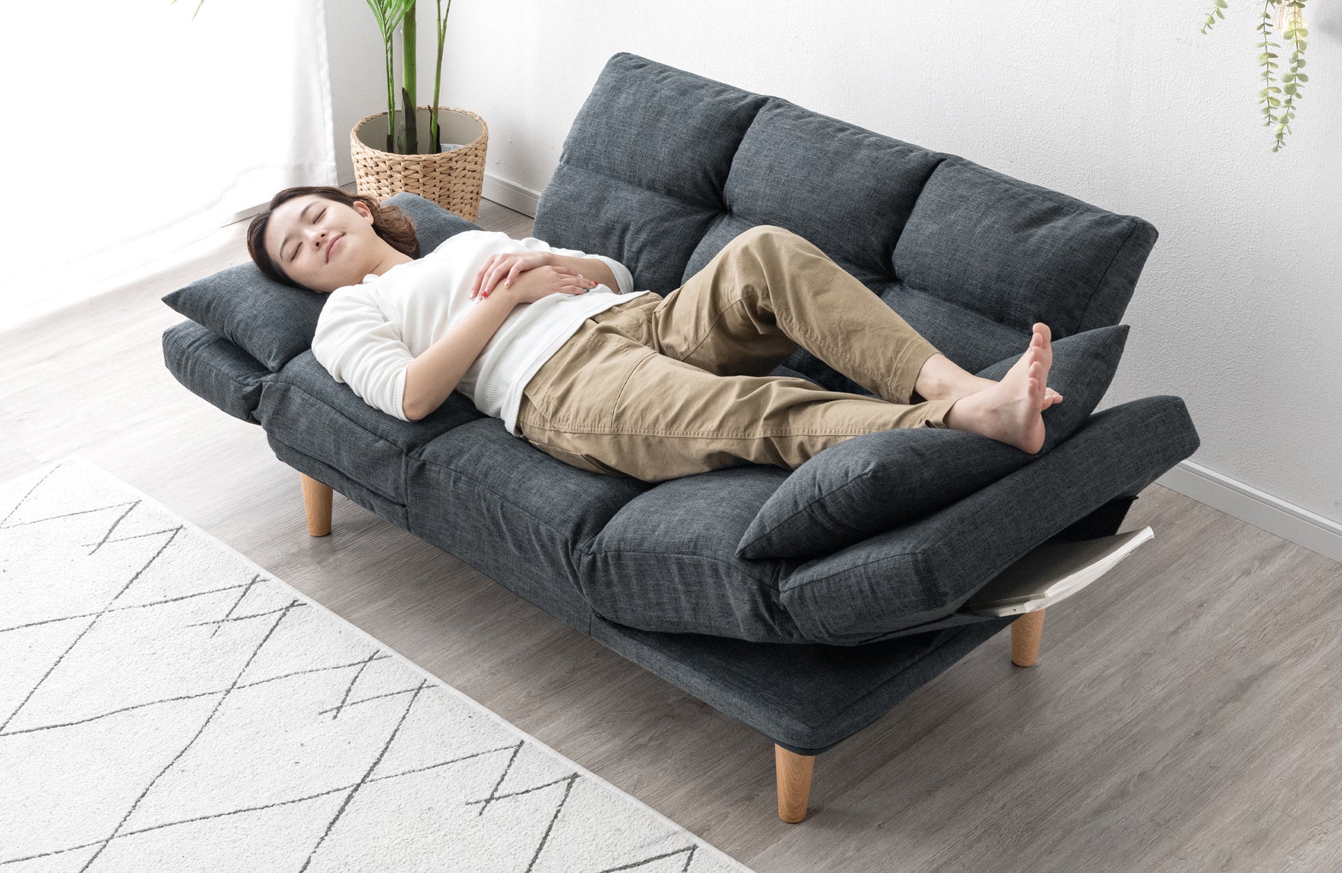 特に座面の角度調節機能は、これまでのソファにはなかった新機能で、角度を調整することで、座面を背もたれのように使ったり、脚を上げてリラックスしたりすることが可能です。ソファで横になったり脚を上げてくつろいだりといったリアルなくつろぎ姿勢をサポートし、“ずぼらで快適な姿勢”で疲れた身体をしっかり休めることができるアイテムです。