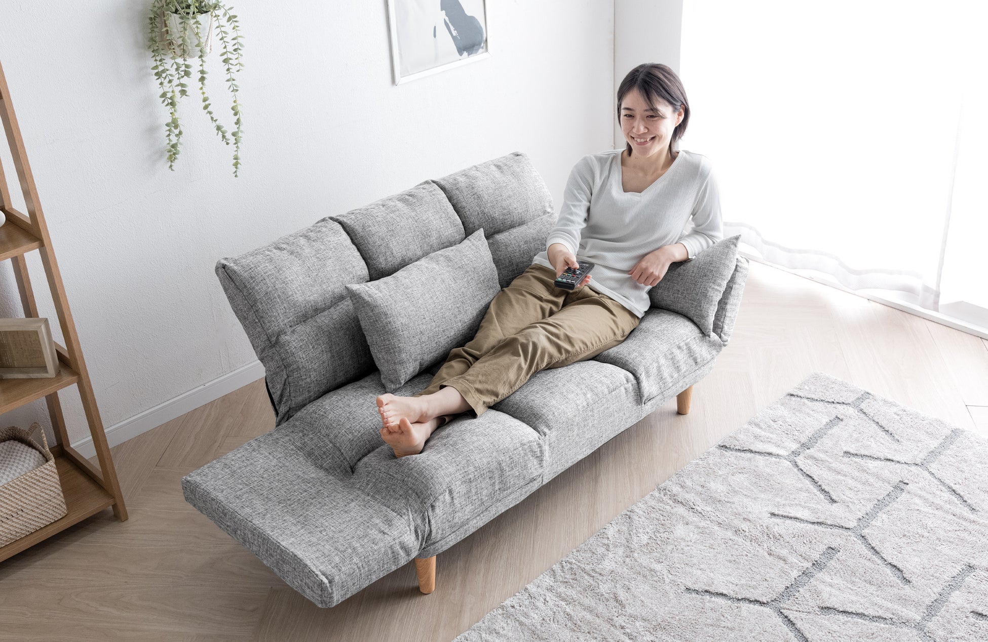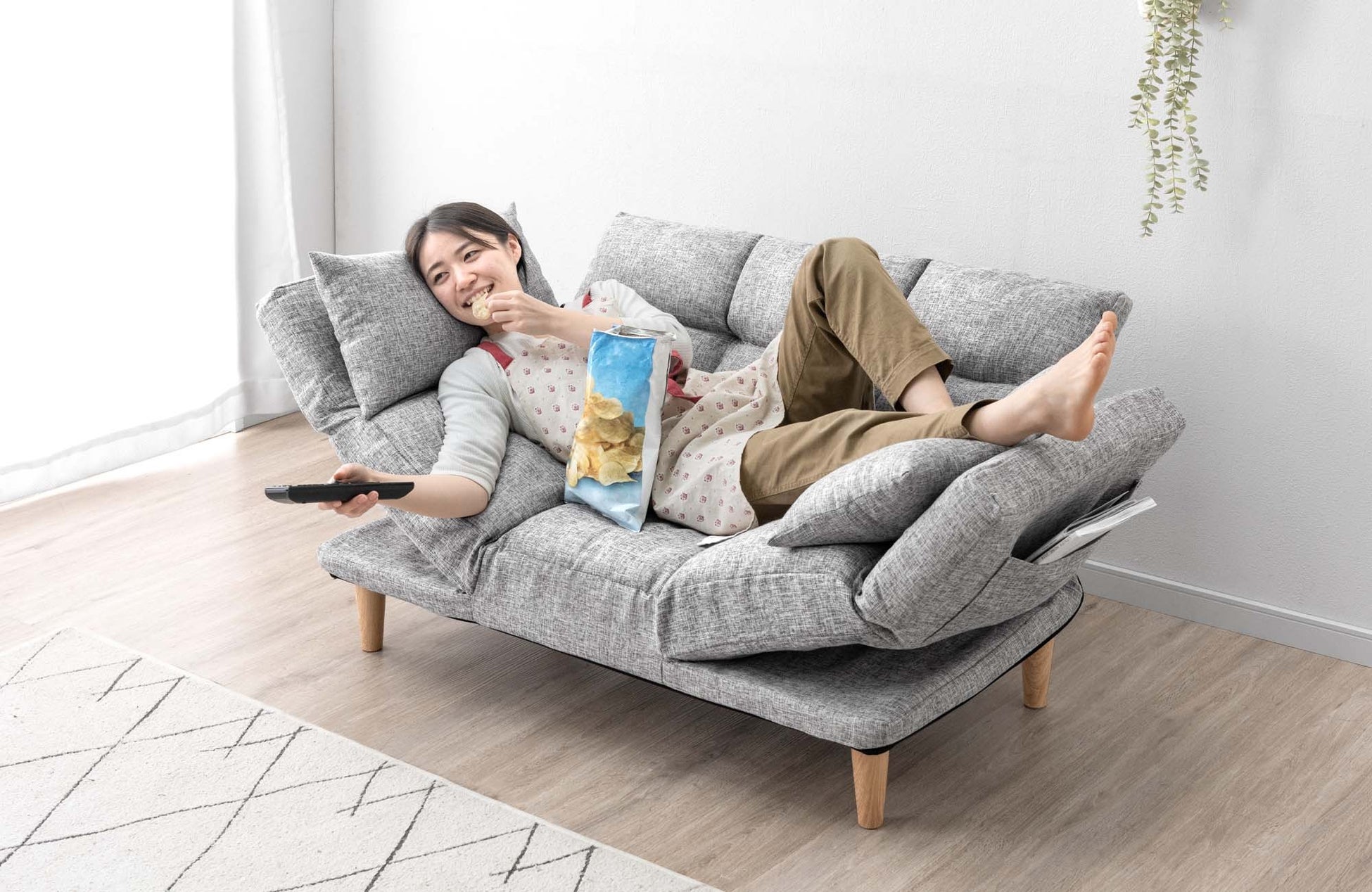 【タンスのゲン】座面の角度調節で、リアルなリラックス姿勢をより快適にする『ずぼらソファ』を発売座面、肘掛け、背もたれ、合計5か所のリクライニング機能で、本当になりたい体勢で寛げる!