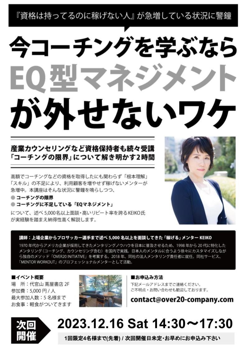 株式会社OVER20&Company.( 本社:東京都港区、代表取締役:石堂里佳・糸井達哉 / 以下「OVER20」)が主催する大人気セミナー「今コーチングを学ぶなら「EQ型マネジメント」が外せないワケ」大好評につき、追加日程を設け、セミナーを開催します。