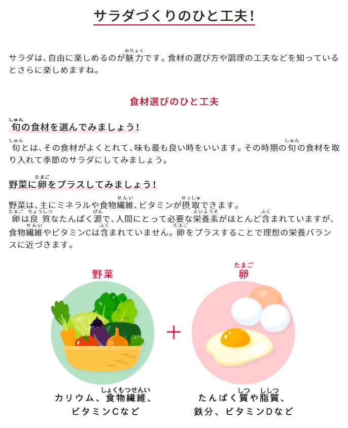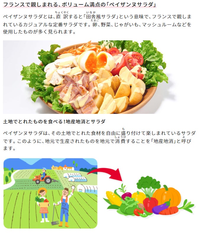 今回公開した「世界のサラダを調べよう!つくってみよう!」では、「ペイザンヌサラダ」「コブサラダ」「シーザーサラダ」を中心に、それぞれの発祥の国や基本の作り方を紹介しています。また、作るときの楽しみ方やアレンジなど、サラダづくりのひと工夫を提案しています。