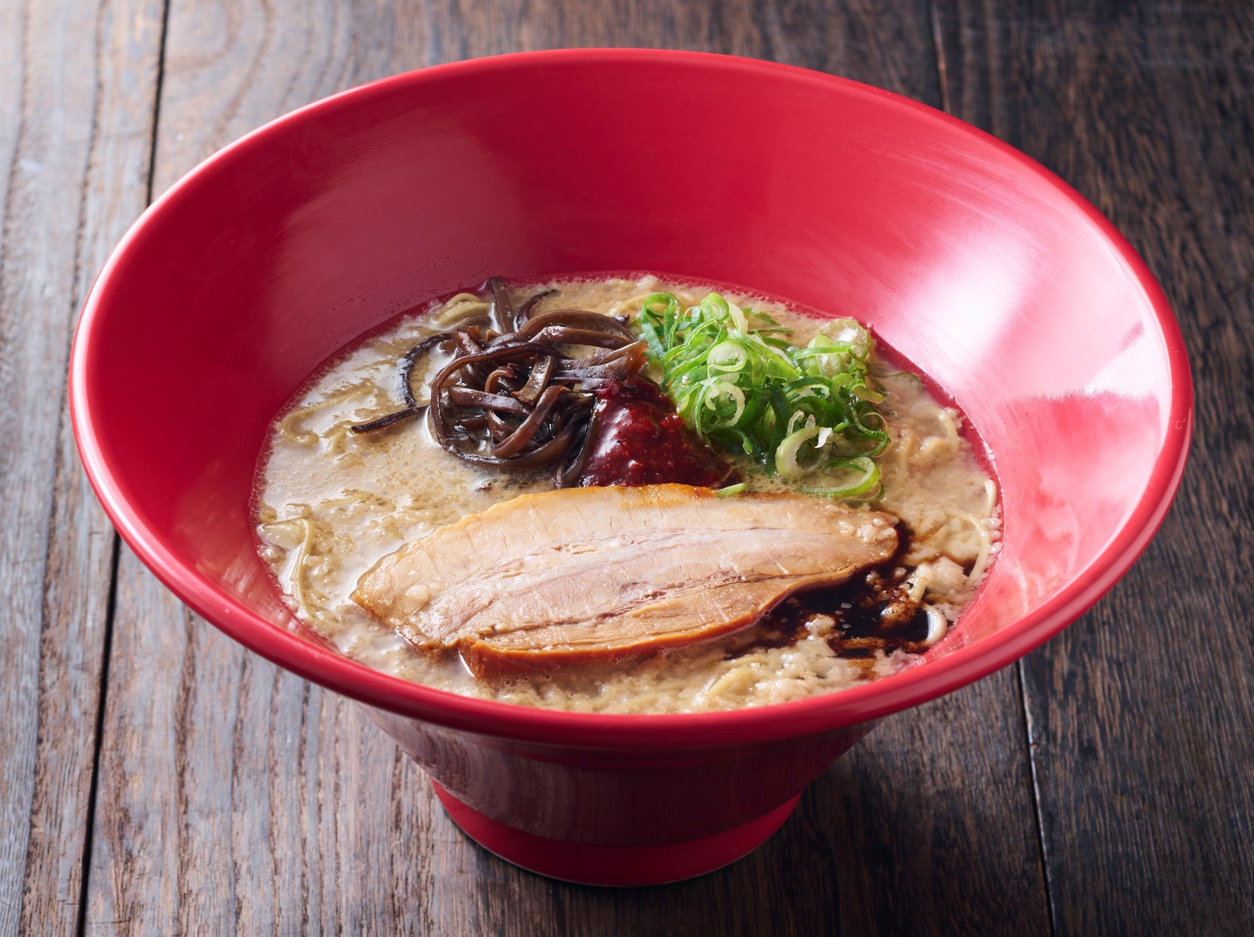 にんにくの風味が効いた香油と特製の辛味噌を溶かしながら楽しむ、コクと深みの一杯。スープには、醤油ベースのかえしと背油を使用。深みのあるとんこつスープと相性の良い、小麦が香る中細麺に、柔らかくジューシーな厚切りバラチャーシューをのせて。白丸が正統派ならば、赤丸はとんこつラーメンの可能性を広げた革新派。