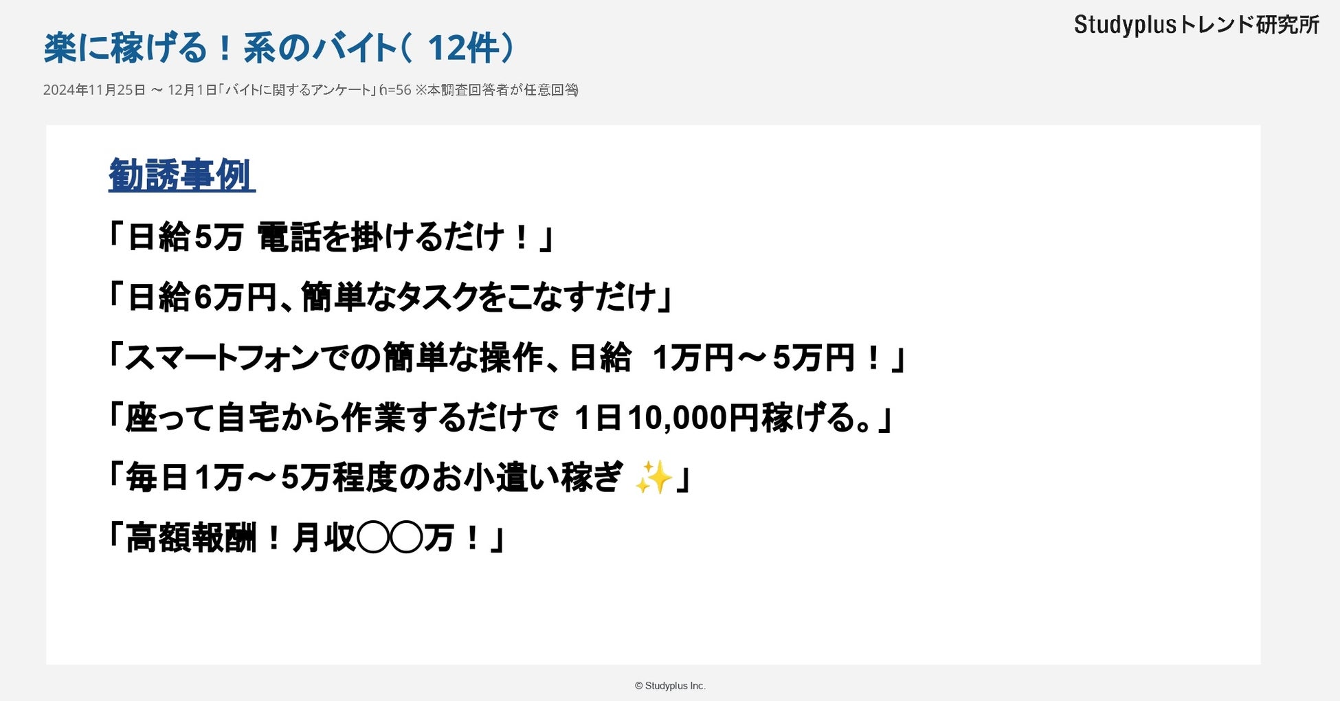 今回の調査で明らかになった「具体的な募集内容」や「怪しいと感じた観点」を共有することで、ひとりでも思いとどまる学生が増えることを願っています。