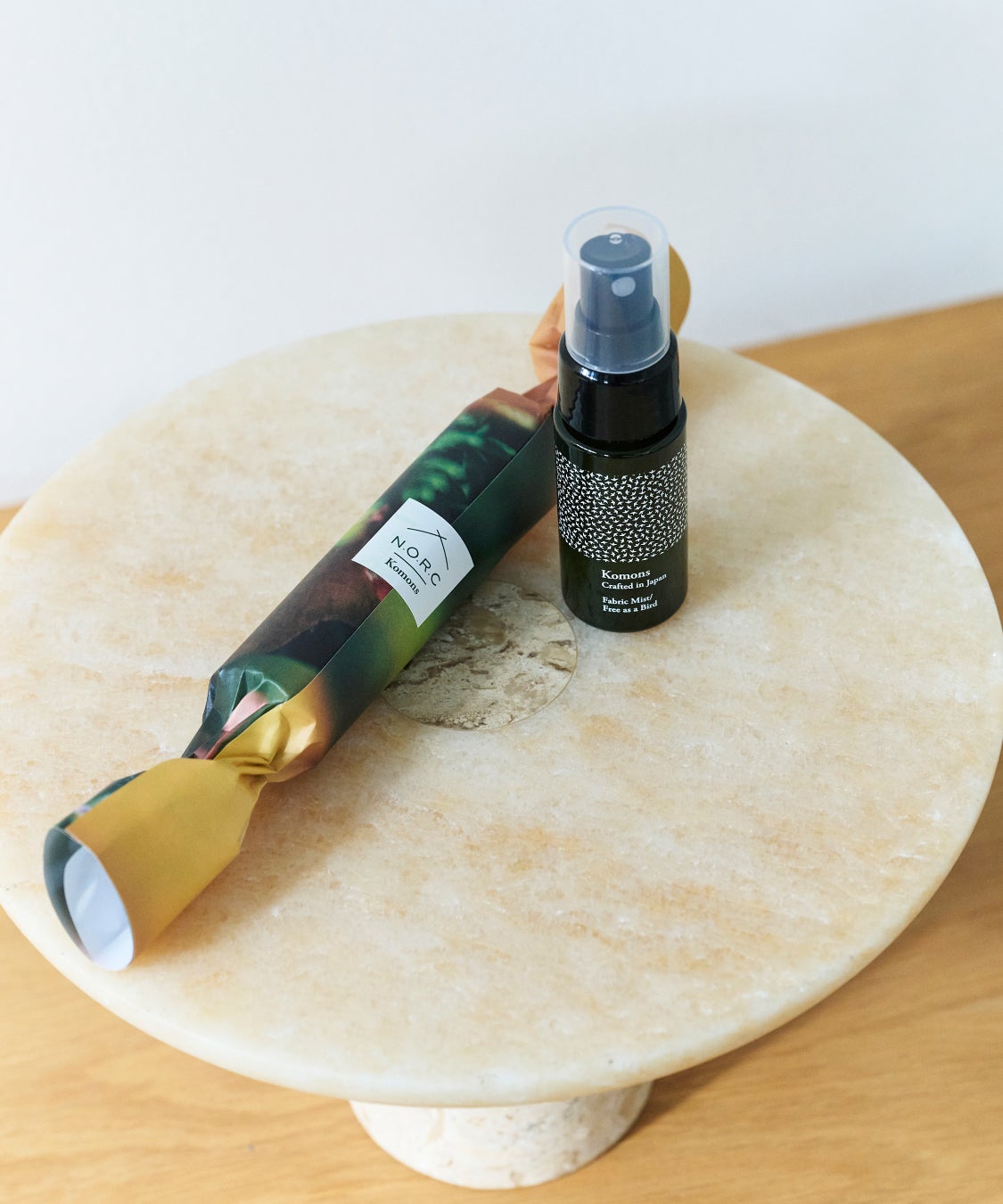 ポップアップ期間中に、1回のお会計で25,000円(税込)以上ご購入のお客様に先着順で天然精油の香りにこだわるホームケアブランド【Komons(コモンズ)】とコラボレーションしたNORC別注『ファブリックミスト』をプレゼントいたします。ヒバ・ヒノキ・ホーリーフをベースにした、奥行きのある香りを楽しめるファブリックミストです。持ち運びに便利なMiniサイズで、外出先や旅先でも気軽にお使いいただけます。