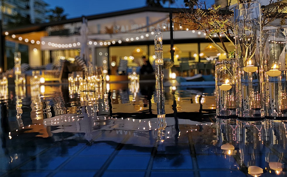 美しいサンセットから夜にかけて、水盤一面にキャンドルを並べ、煌めく優しい灯りで彩ります。水面にリフレクションする幻想的な光に包まれながらお食事をお愉しみいただけます。