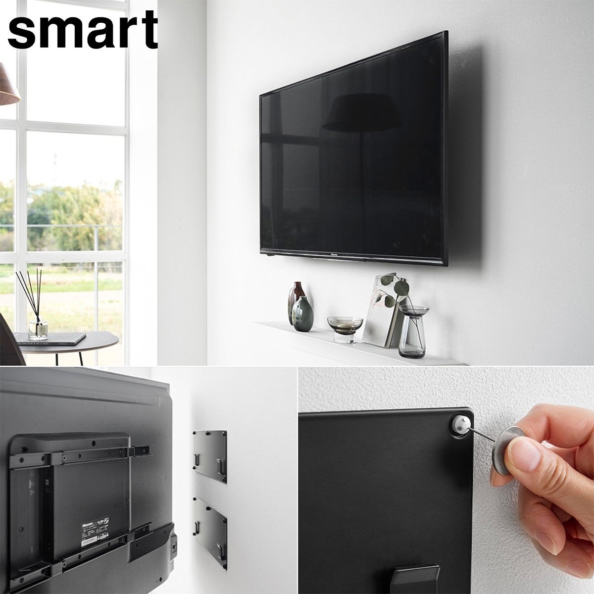 壁に2枚のプレートを取り付け、テレビ背面に固定したバーを掛けるだけの簡単構造で、バーはテレビ背面のVESA規格ネジ穴を利用して取り付けられます。