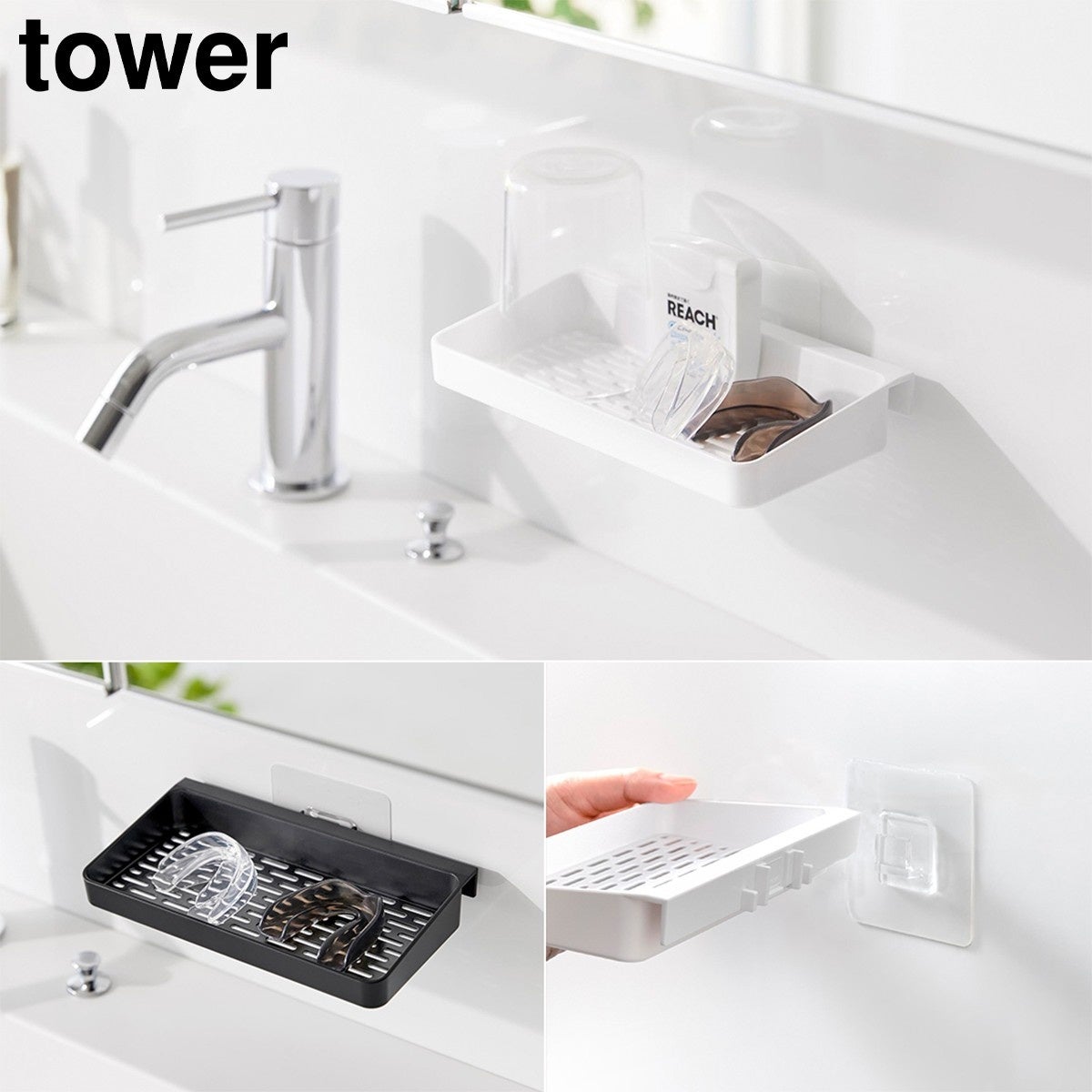 洗面台パネルやタイルなどにフィルムフックで簡単に取り付けできる、マウスピース水切りラックです。