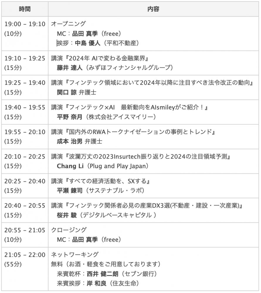 今回は「フィンテックトレンド2024」と題し、フィンテックや金融トレンドに詳しい専門家たちが、来年度のフィンテックなどの動向や予想についてお話しします。フィンテック、InsurTech、法制度、IT、Web3、PropTech(不動産テック)などの分野に精通した専門家からの現状の説明や動向・予測を聞くことで、自らの未来を切り開くヒントとして新たな気づきを得ることを目的としています。