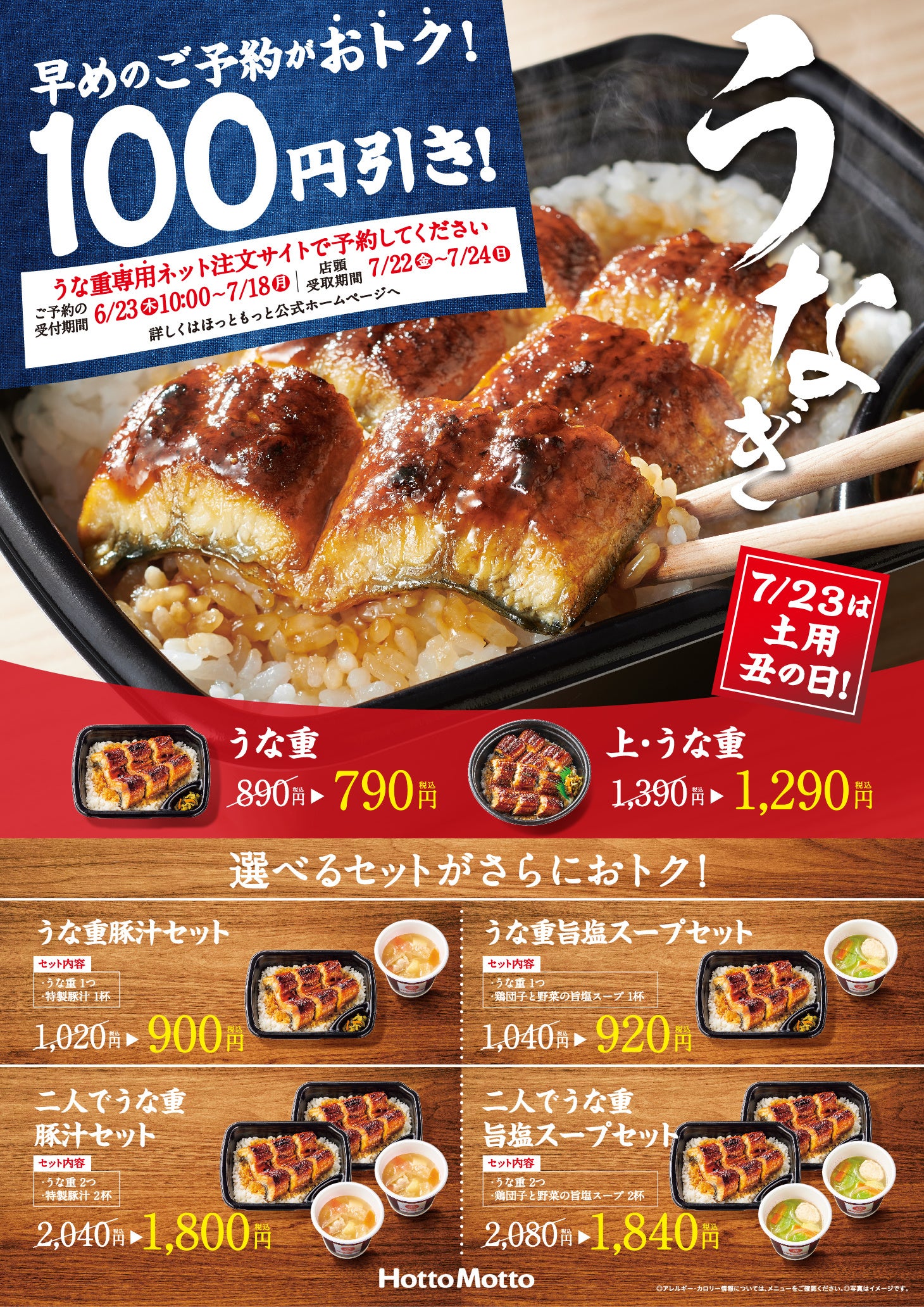 株式会社プレナスは、持ち帰り弁当の「Hotto Motto (ほっともっと)」を、2022年5月末現在、2,480店舗展開しております。このたび「ほっともっと」では、夏の風物詩『うな重』890円、『上・うな重』1,390円を発売いたします。また、6月23日(木)より7月18日(月)までに、店頭やうな重専用ネット注文サイトよりご予約いただくと、土用の丑の日に合わせて7月22日(金)より7月24日(日)までの3日間限定で100円引きで購入いただけるキャンペーンを実施いたします。同時に、当キャンペーンは、「Hotto Motto grill(ほっともっとグリル)」でも実施します。