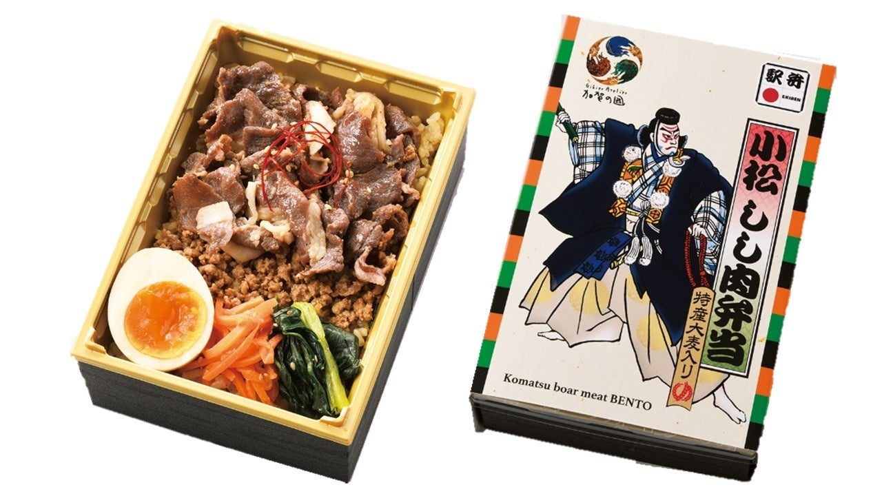 1896年創業の老舗調製元「高野商店」が手掛ける新作駅弁。小松市を含む南加賀地域は「ジビエ利用モデル地区」として農林水産省に選定されています。大麦入りご飯の上に小松市産シシ肉のすき焼き煮と甘く味付けしたそぼろを盛り付けました。シシ肉のしっかりとした弾力、旨味、甘味を感じられる一品です。
