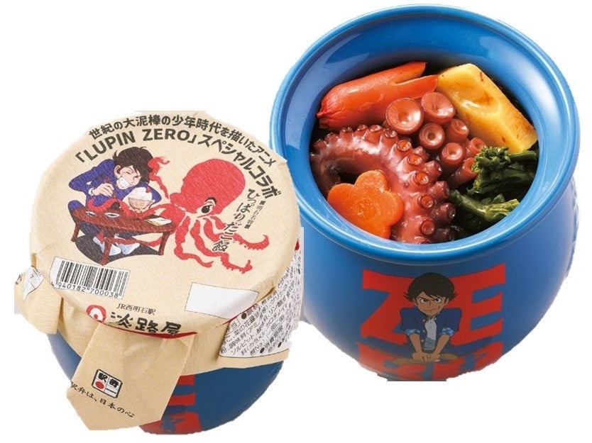 1967年に連載を開始した、モンキー・パンチの人気漫画『ルパン三世』。アニメ「LUPIN ZERO」は、ルパン三世のビギニングを描いたオリジナル作品。淡路屋の人気駅弁「ひっぱりだこ飯」とコラボしました。作品の舞台昭和30年代にちなみ、同時代に誕生したとされるタコウインナーを追加しました。