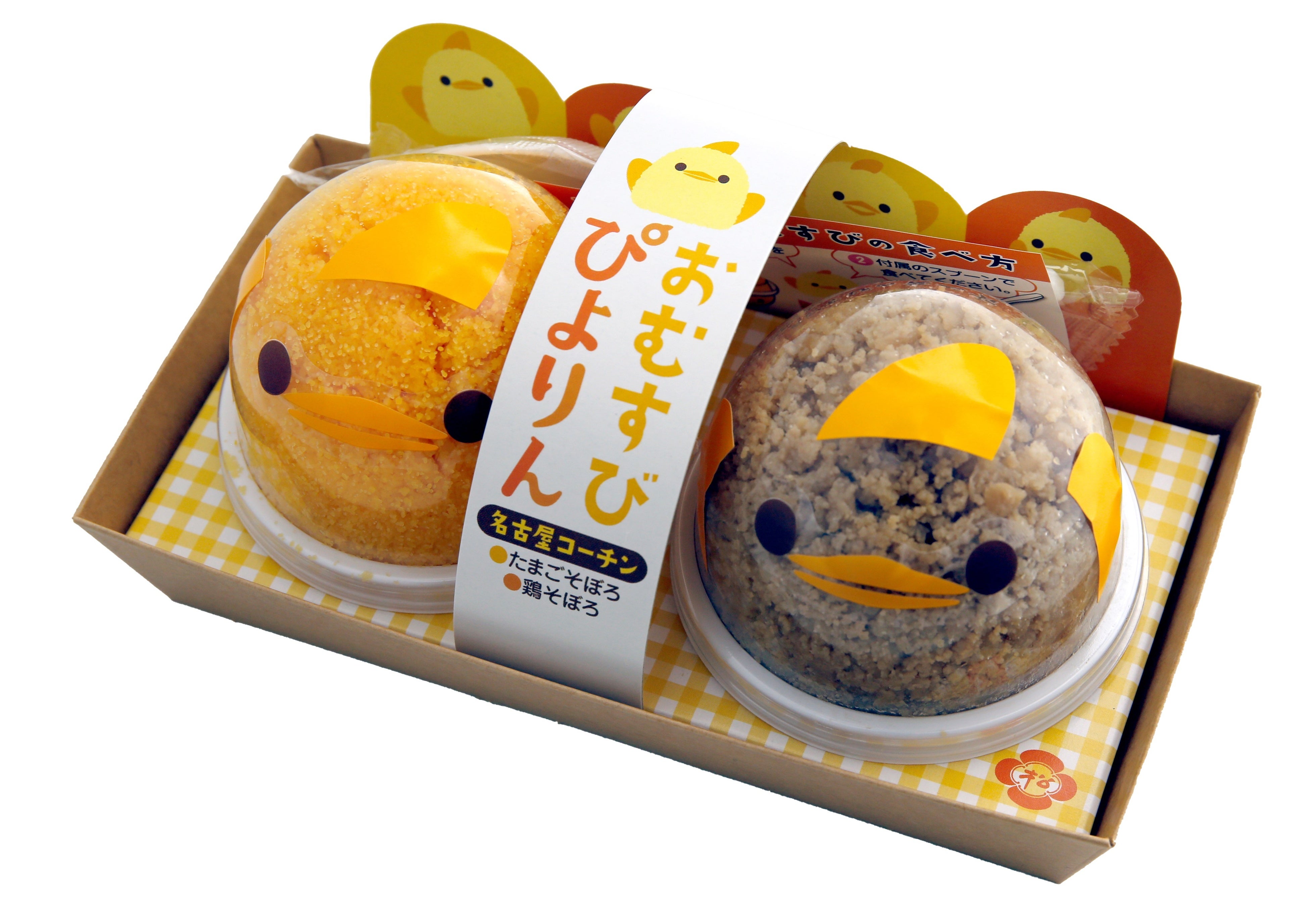「ぴよりん弁当」に次ぐ第2弾。「松浦商店」の伝統の味を受け継いだ「天下とり御飯」の玉子そぼろ、鶏そぼろ味のおにぎりを「ぴよりん」に見立てました。粉雪製法の玉子そぼろと鶏そぼろは名古屋コーチンを使用しています。