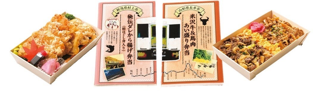 今大会では、2022年8月の豪雨で被災し、一部区間が分断されたままの「米坂線」をクローズアップ。1週目は山形県の焼肉店「黒獅子」による馬肉と米沢牛すき焼き風を味わえる弁当を、2週目は新潟県の「かもめ弁当」による大判から揚げと村上鮭のほぐし身を盛りつけた弁当を展開します。1週目と2週目の弁当の掛紙を合わせると掛け紙に描かれる路線図と鉄道車両の顔が繋がります。