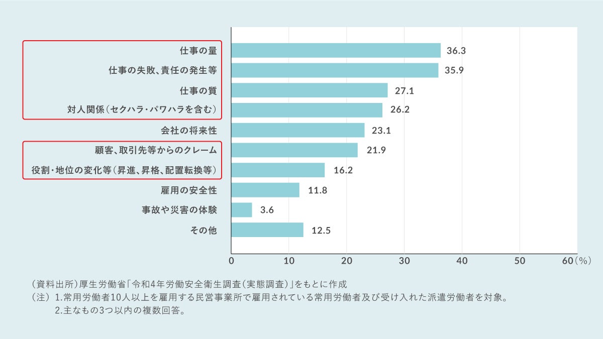 ストレスの内容をみると、「仕事の量」(36.3%)が最も多く、次いで「仕事の失敗、責任の発生等」(35.9%)、「仕事の質」(27.1%)となっており、現代社会では仕事に関して多様なストレスを抱えていることがわかります。
