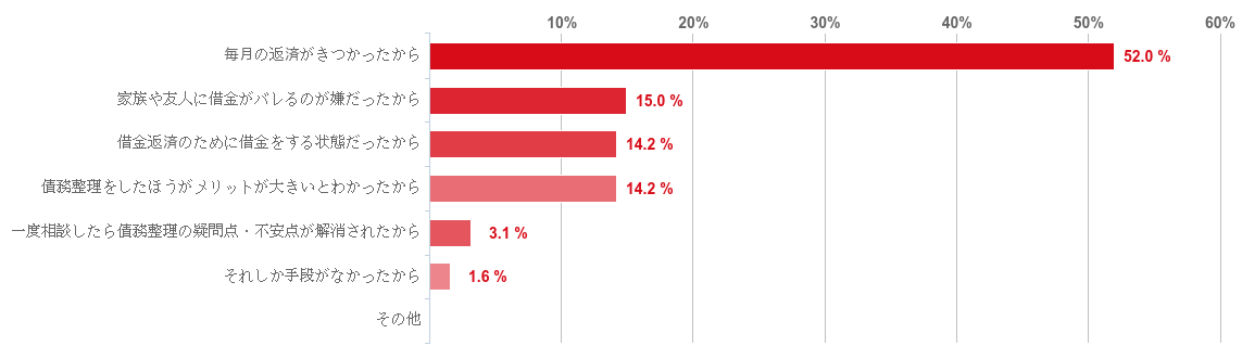 「毎月の返済がきつかったから」が52.0%で圧倒的に多かった。なお、その他には「家族や友人に借金がバレるのが嫌だったから」(15.0%)、「借金返済のために借金をする状態だったから」(14.2%)などの回答が集まった。