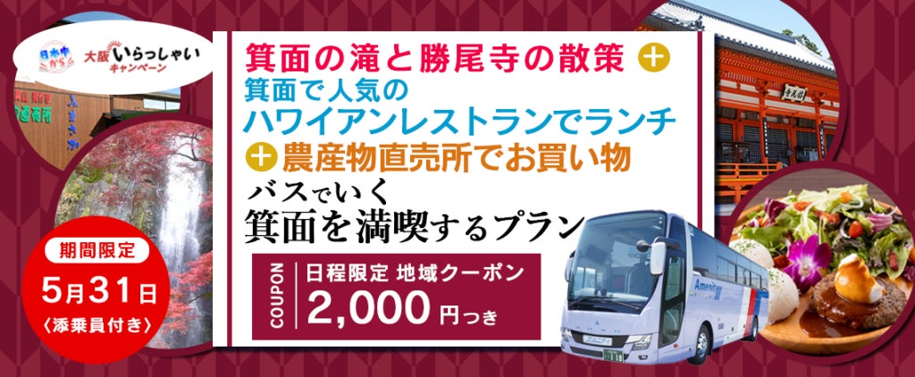 【5月31日(水)大阪出発+添乗員付きバスツアー】箕面の滝と勝尾寺の散策+箕面で人気のハワイアンレストランでランチ+農産物直売所でお買い物 バスで行く『箕面を満喫するプラン』