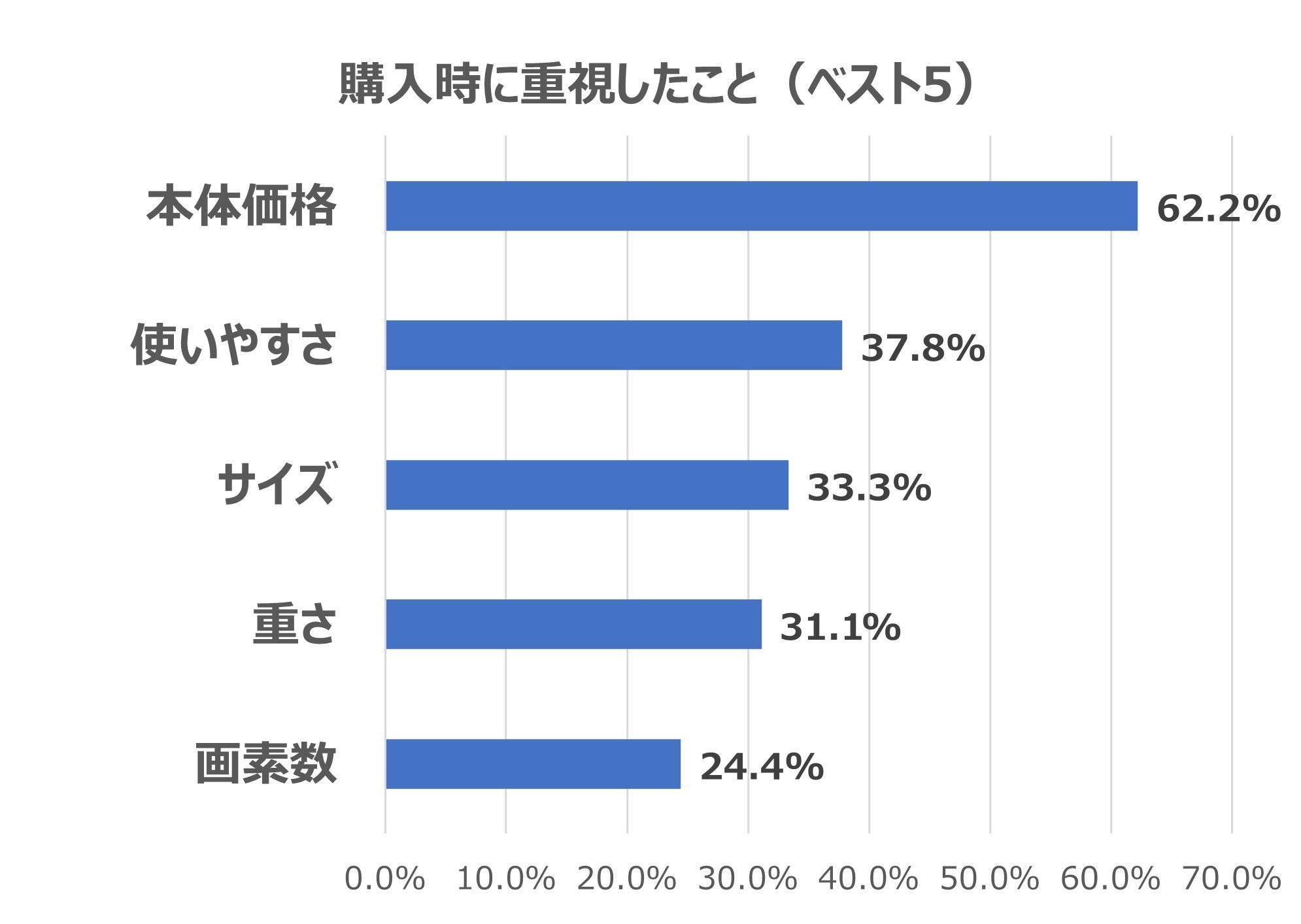デジタル一眼カメラを買って良かったと思う点や、スマホとの使い分けやこだわり、撮影についてのエピソードを聞いたところ、「スマホでの写真は画質に限界があり、デジタル一眼カメラの方が遠方でもよく撮れて、運動会やお遊戯会のときには良かった」(30代・栃木県)、「スマホでは子どもをパッと撮る。デジタル一眼カメラはきれいに撮りたい物や、趣味で撮りたいときに使っている」(30代・大阪府)、「一眼カメラだと、写真を撮るためにいろいろと出かけたくなる」 (40代・大阪府)、「月の撮影ができることが一番です。月食を撮影し、クレーターの起伏まで分かり、嬉しかった」 (50代・埼玉県)などの声が寄せられました。撮影のために出かけたり、美しく撮影したいときにデジタル一眼カメラが利用されていることが分かりました。