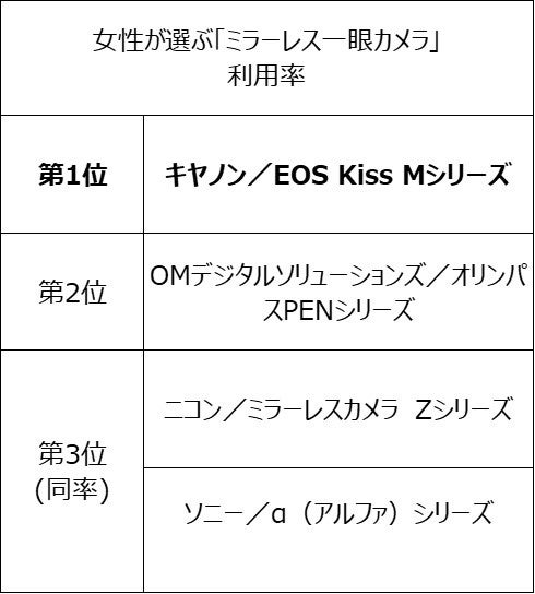 ◆女性が選ぶ「ミラーレス一眼カメラ」ランキング、利用率1位は「キヤノン/EOS Kiss Mシリーズ」